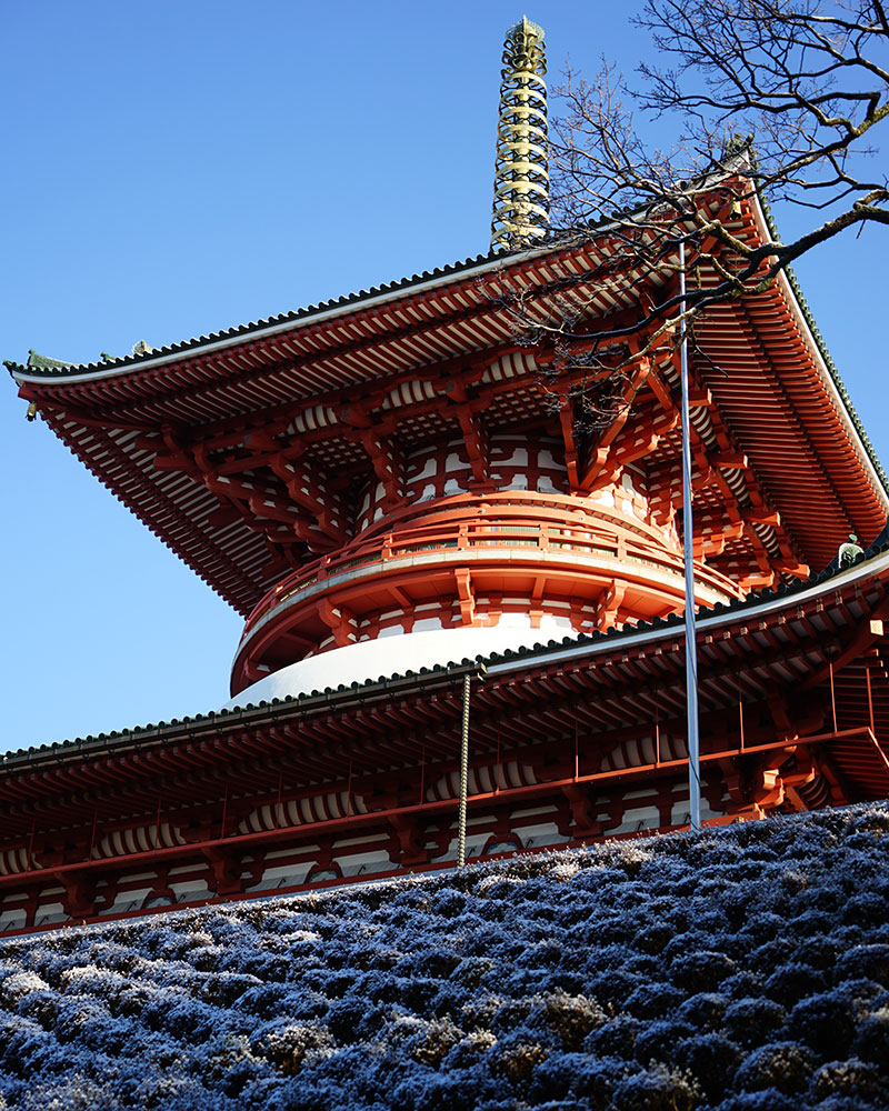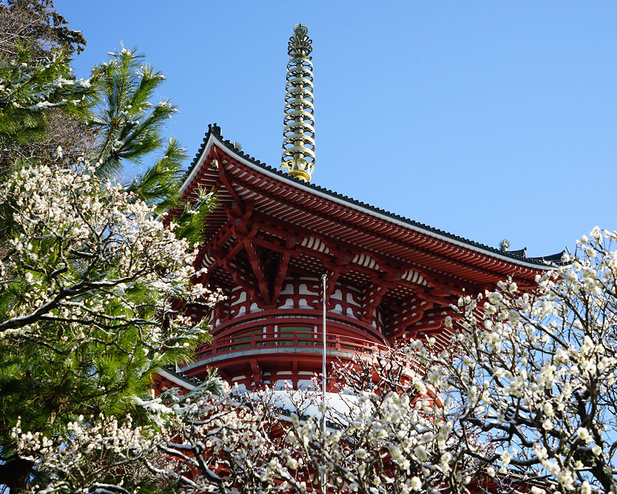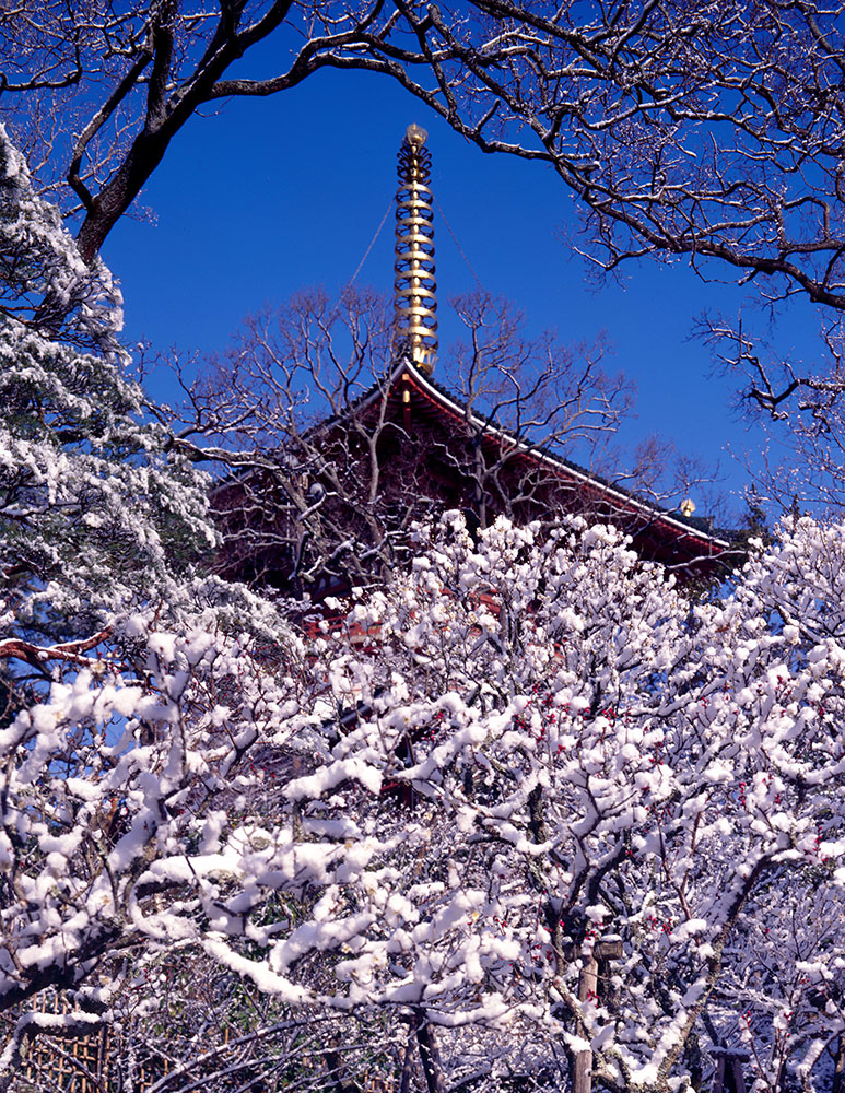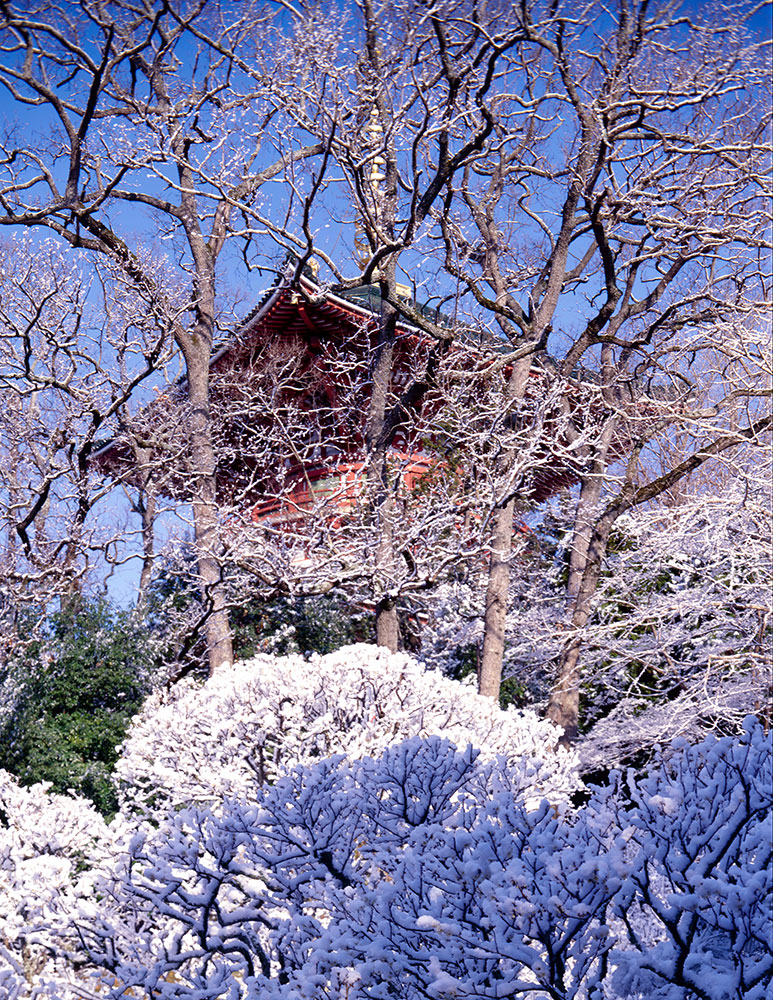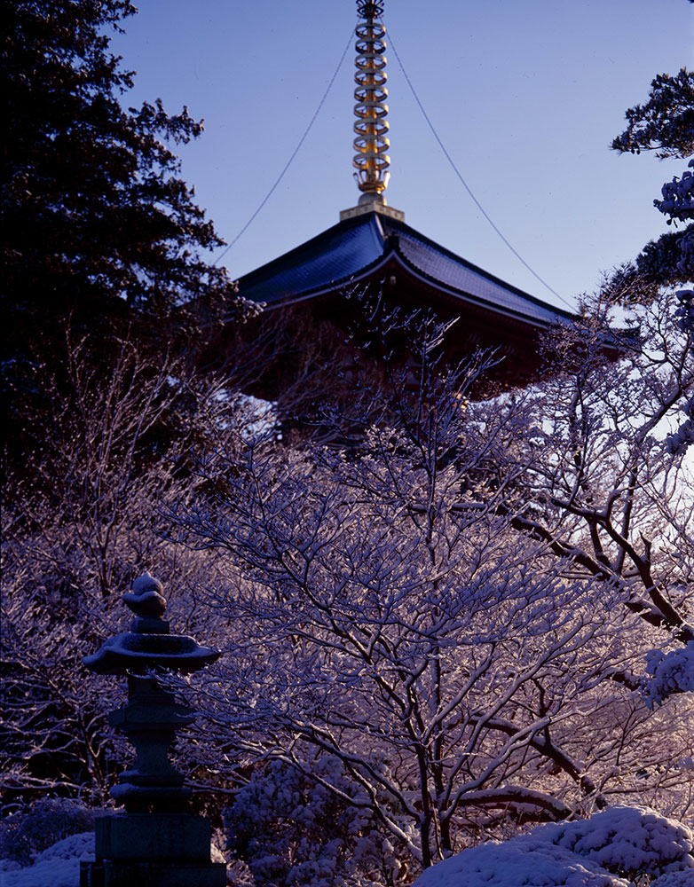 成田で開いた最初の写真展「成田山新勝寺の美」は、ギャラリーの関係で12日からの予定が7日からに変更になりました。その初日、友人のお祝い酒に酔って店を出ると雪が降っていました。3月の雪です、積もると思わずに朝寝していると、母親に起こされました。「雪だよ!」と。淡い雪に空が青く晴れ渡っていました。成田山に駆けつけて、撮影したのが「春雪の平和大塔」です。
