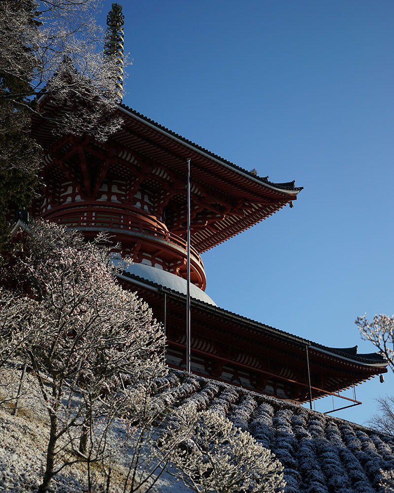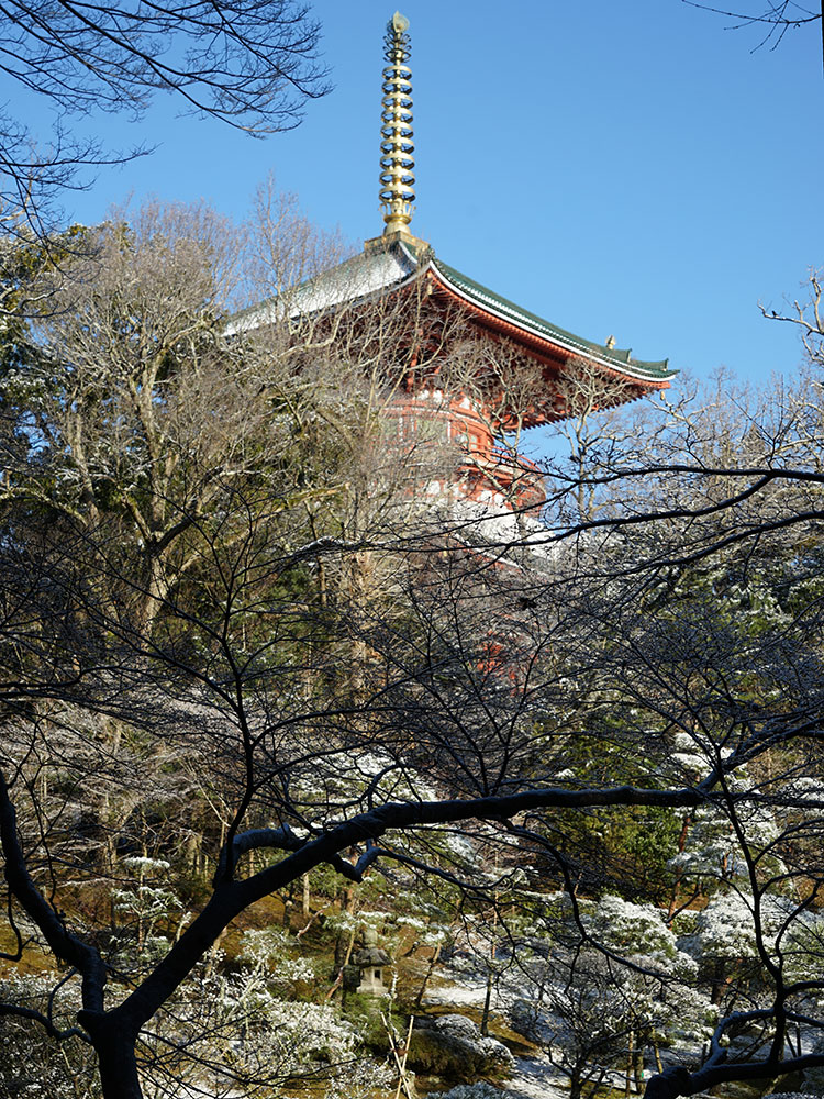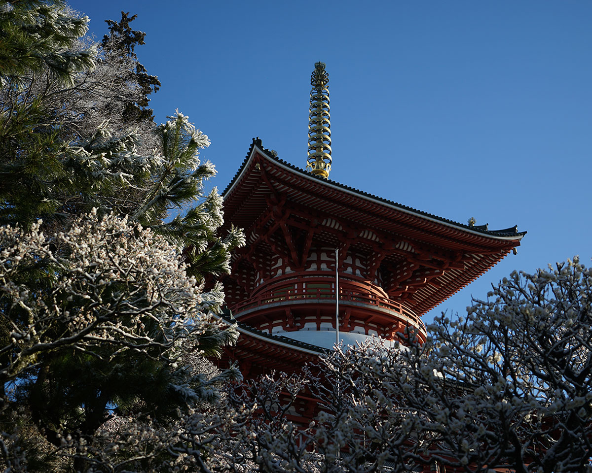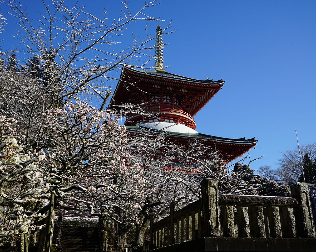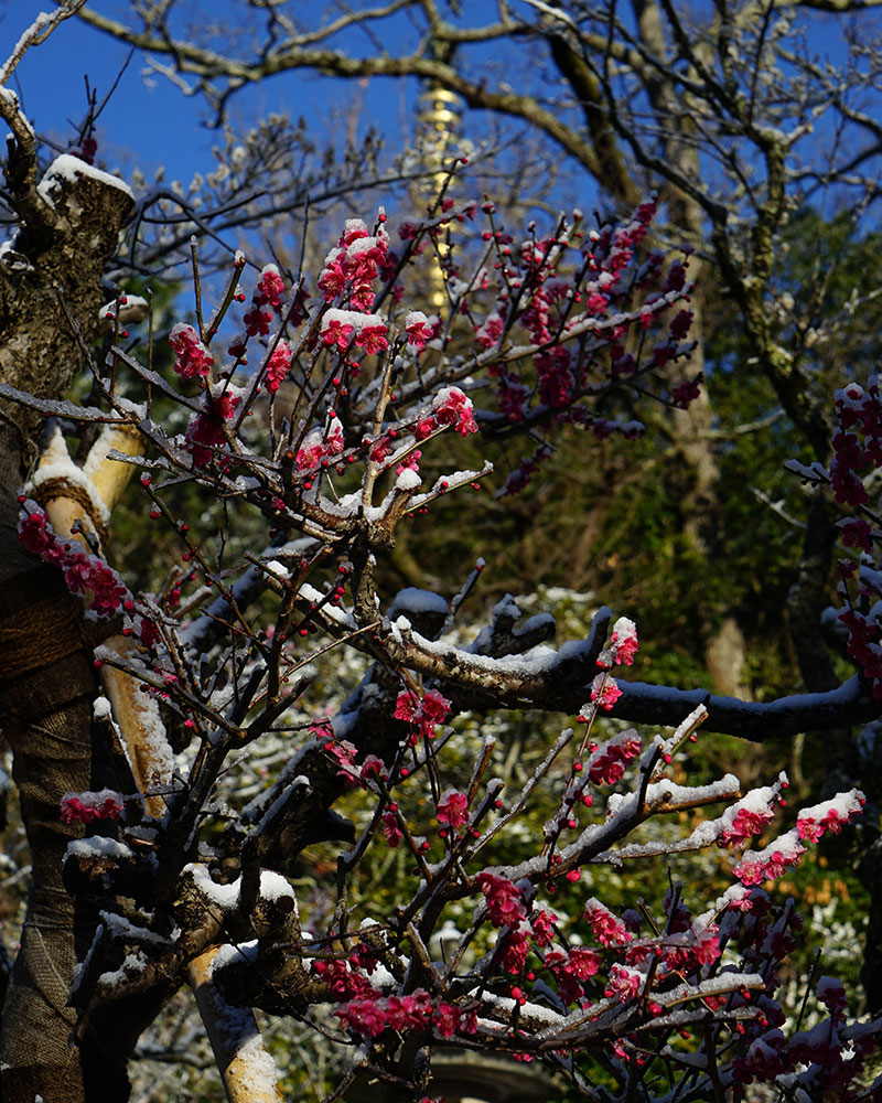 母が亡くなり、お通夜を終えた朝は快晴で、ほんのわずかな雪がありました。十五年前は、写真展で休暇を取ったおかげで撮れた写真で、お不動様からご褒美をいただいた、と思っていましたが、母が起こしてくれたおかげだったと感謝しました。そして、初七日を終えた翌日、また、雪景色となって、真っ青な空がありました。前夜の天気予報にはない雪でした。それは、かつての雪ほどではないけれど、梅も咲いて、その日、一度限りの風景がありました。