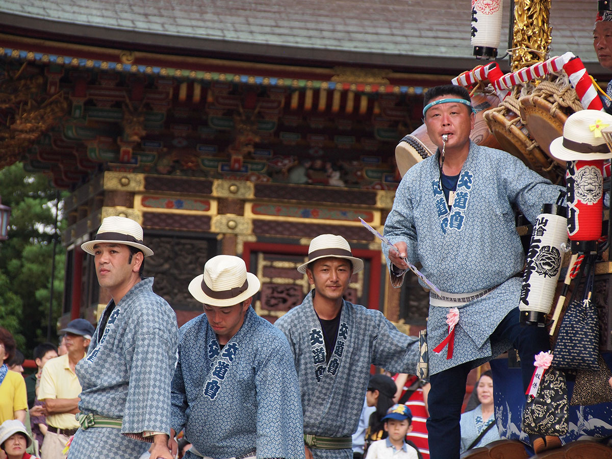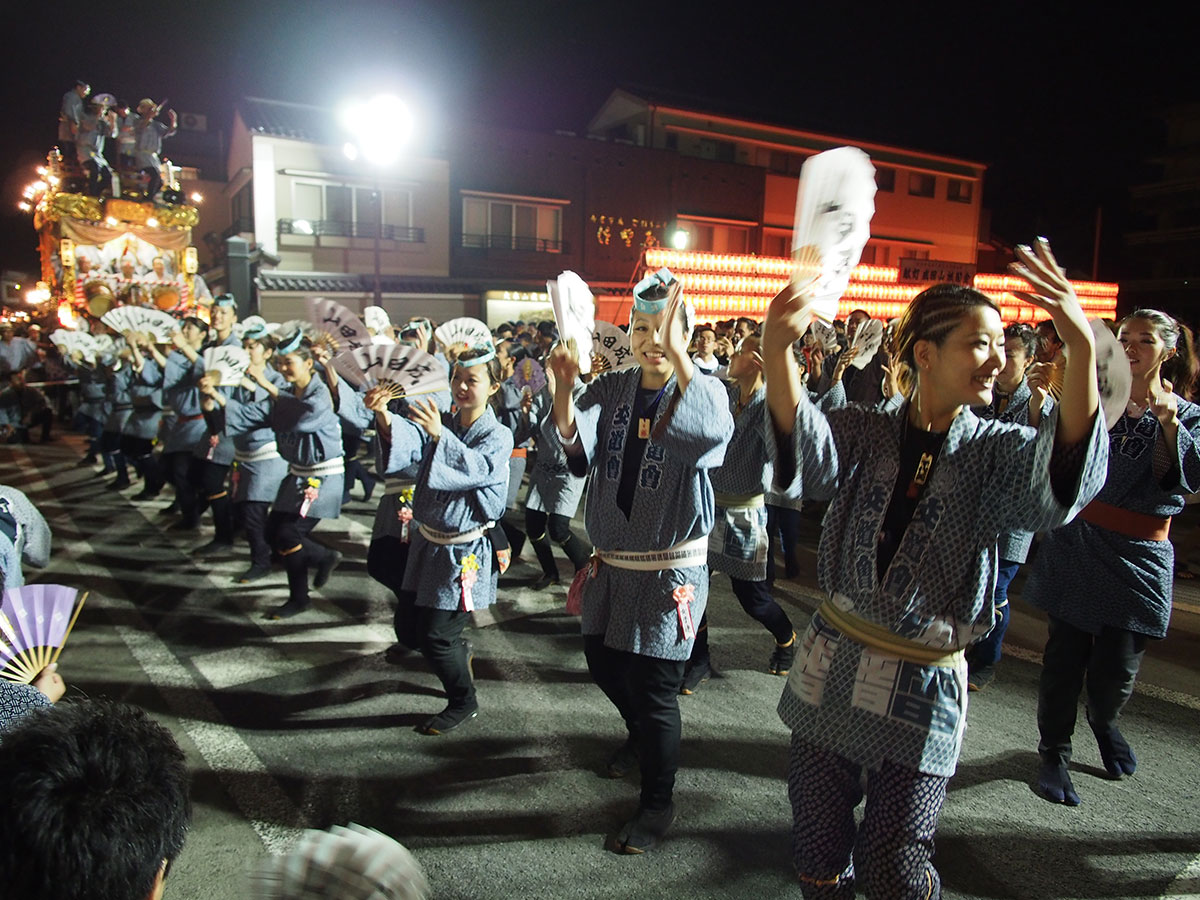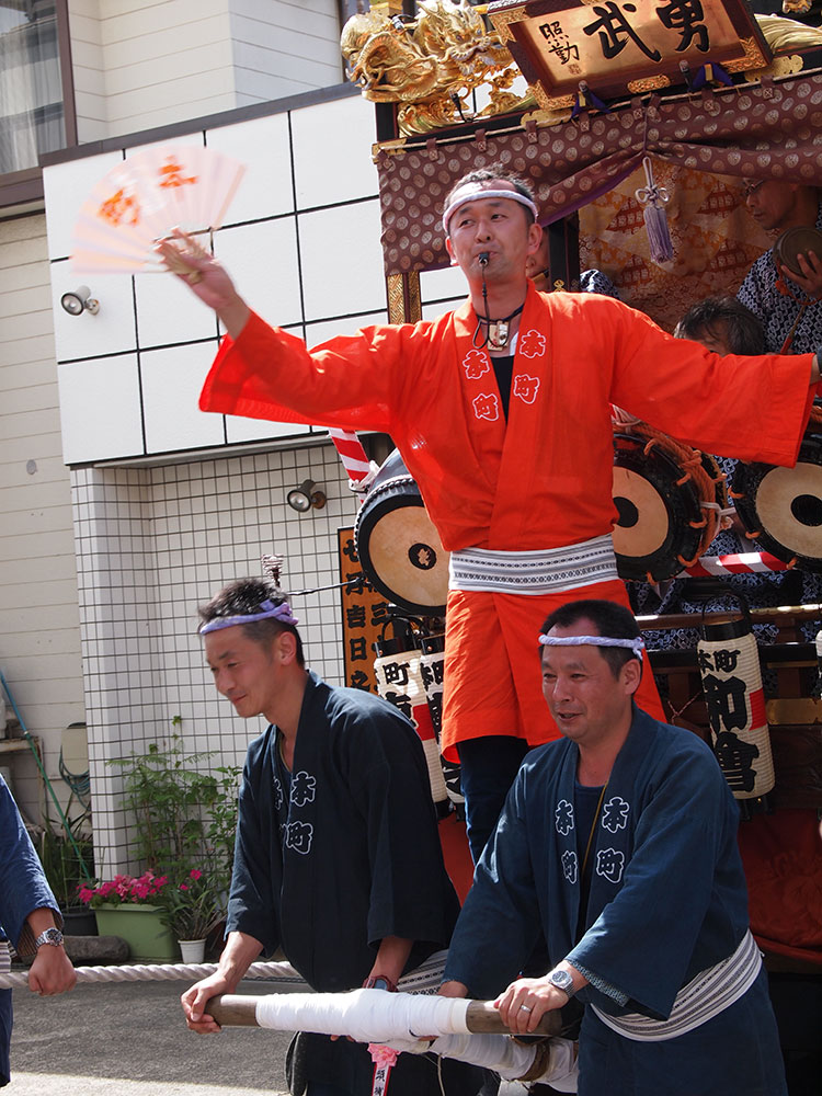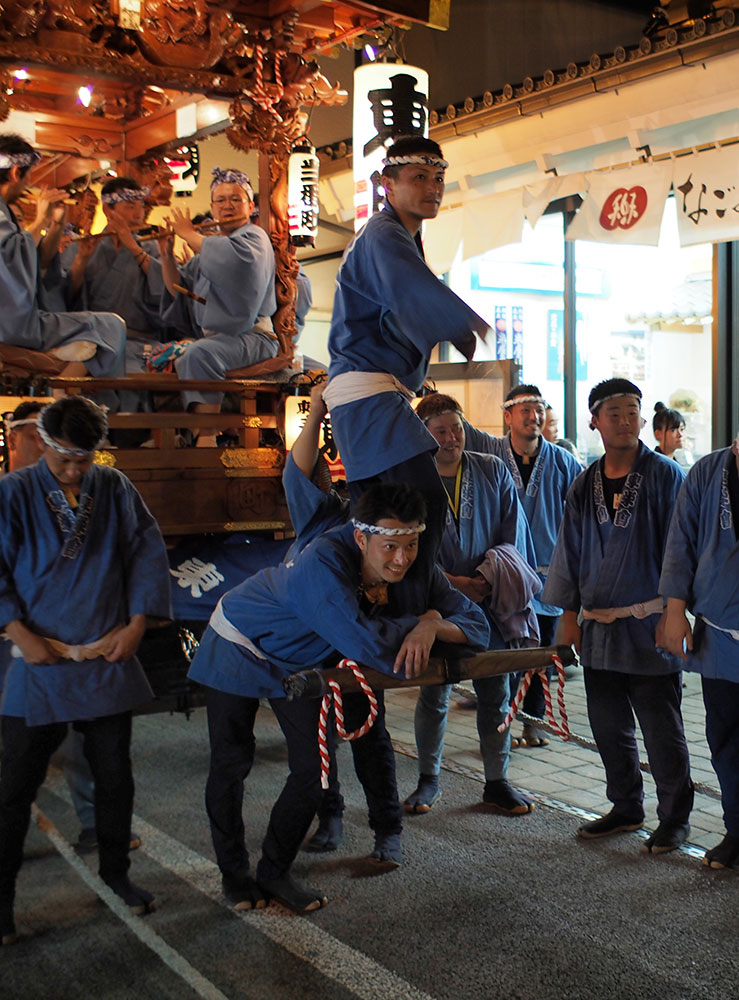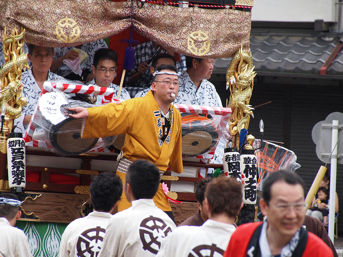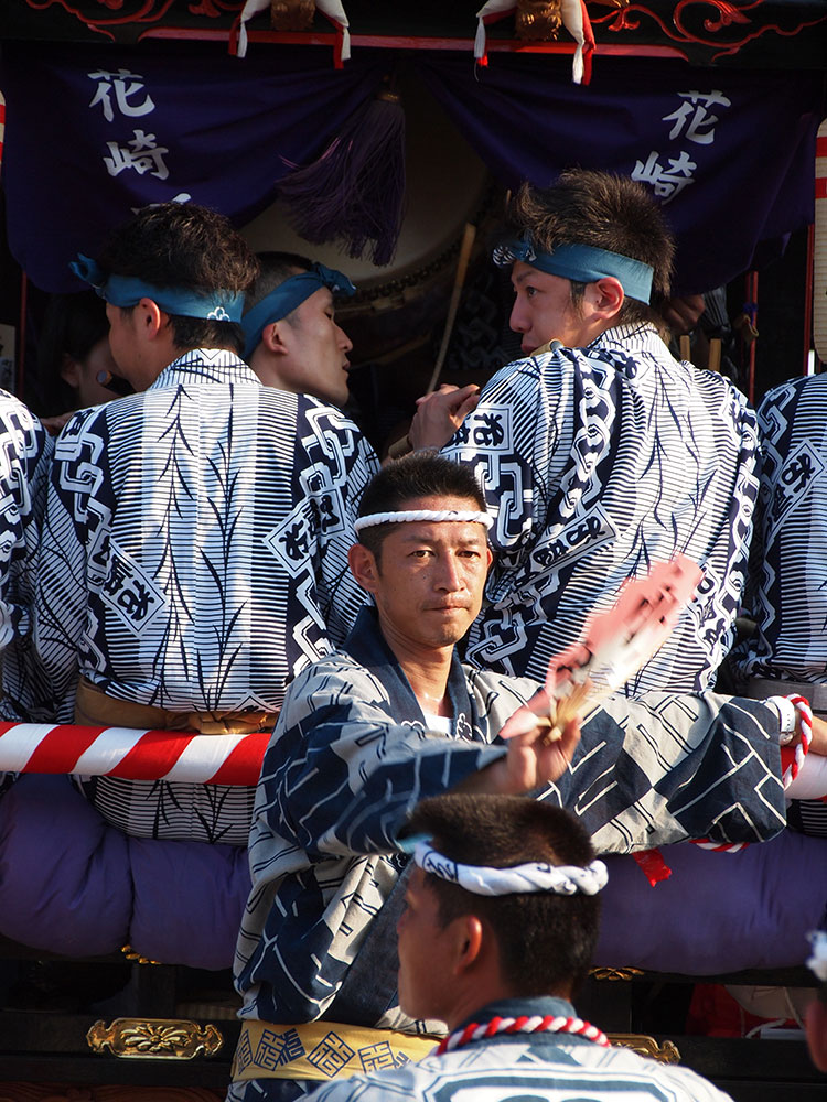 総引きを一台ずつ撮影していて、総門前に戻ろうとすると本町の山車は、もう総門を出ていました。仕方なくカメラを構えると、花火が上がって、山車、総門、花火の構図を作ってくれました。