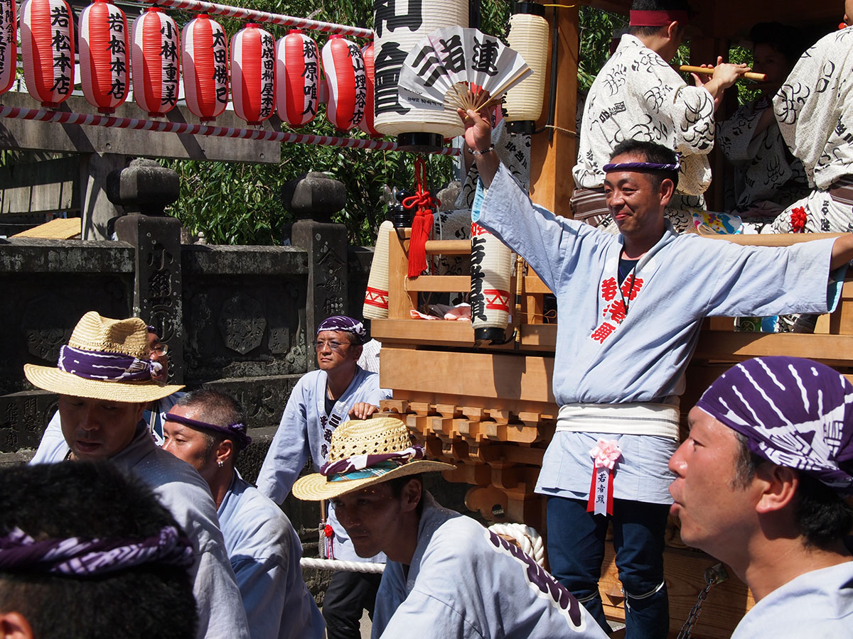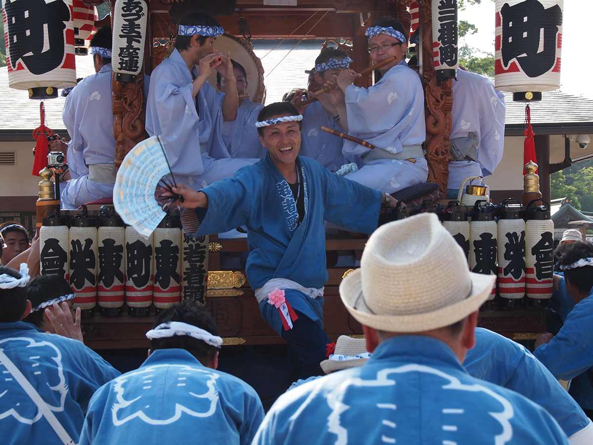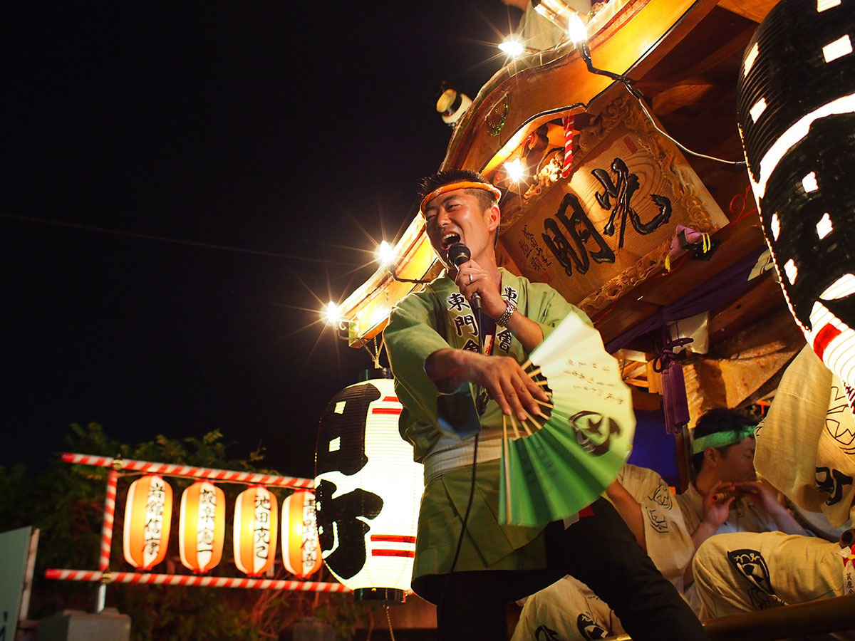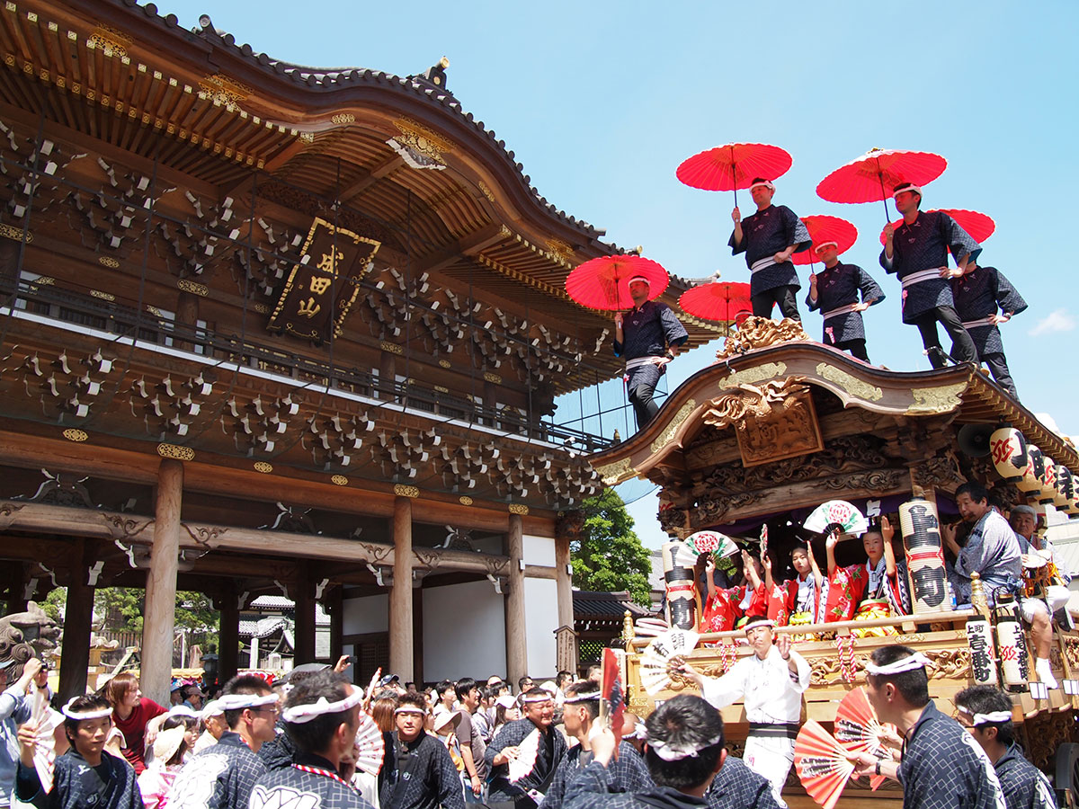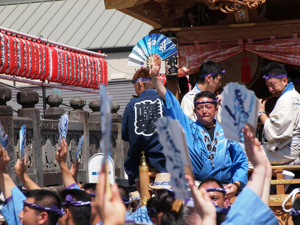 総引きを一台ずつ撮影していて、総門前に戻ろうとすると本町の山車は、もう総門を出ていました。仕方なくカメラを構えると、花火が上がって、山車、総門、花火の構図を作ってくれました。