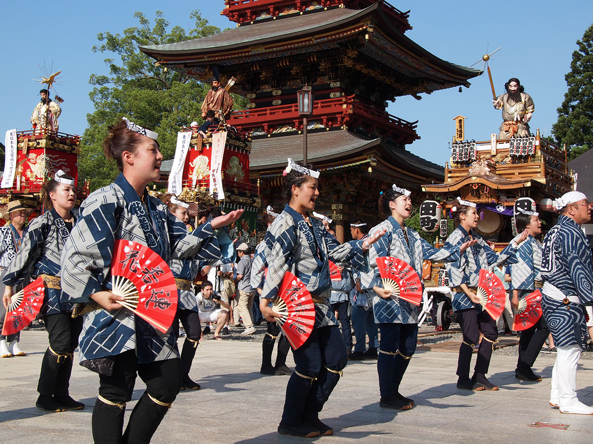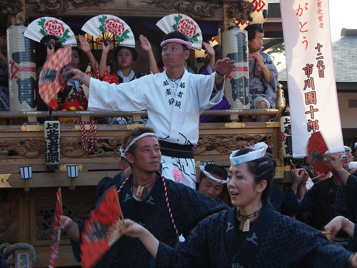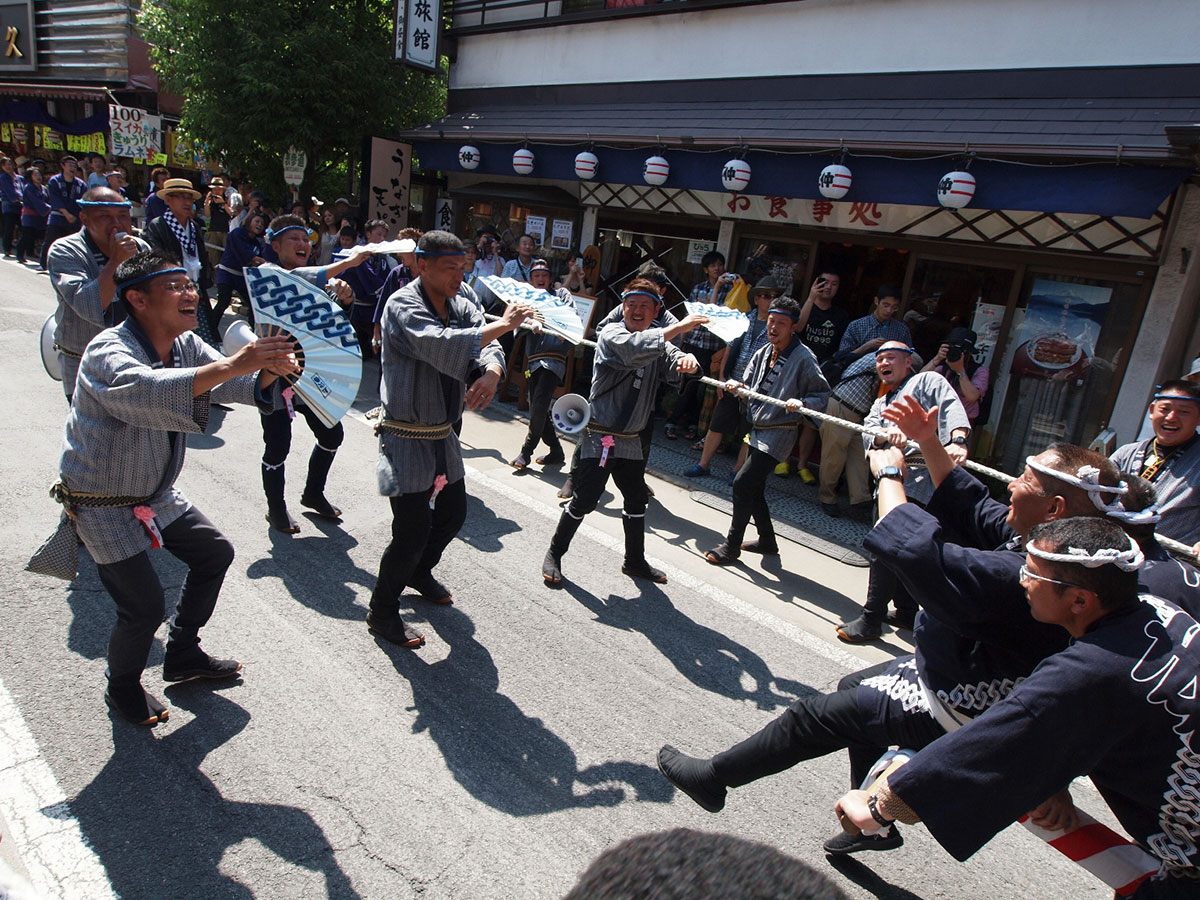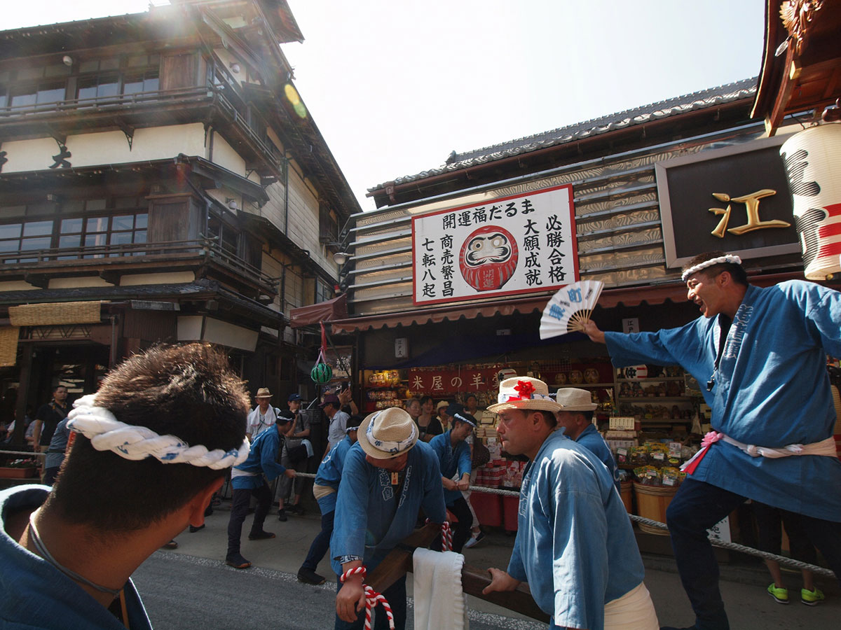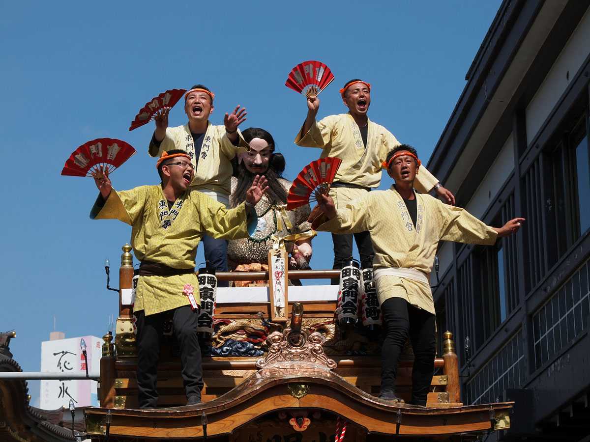 総引きを一台ずつ撮影していて、総門前に戻ろうとすると本町の山車は、もう総門を出ていました。仕方なくカメラを構えると、花火が上がって、山車、総門、花火の構図を作ってくれました。