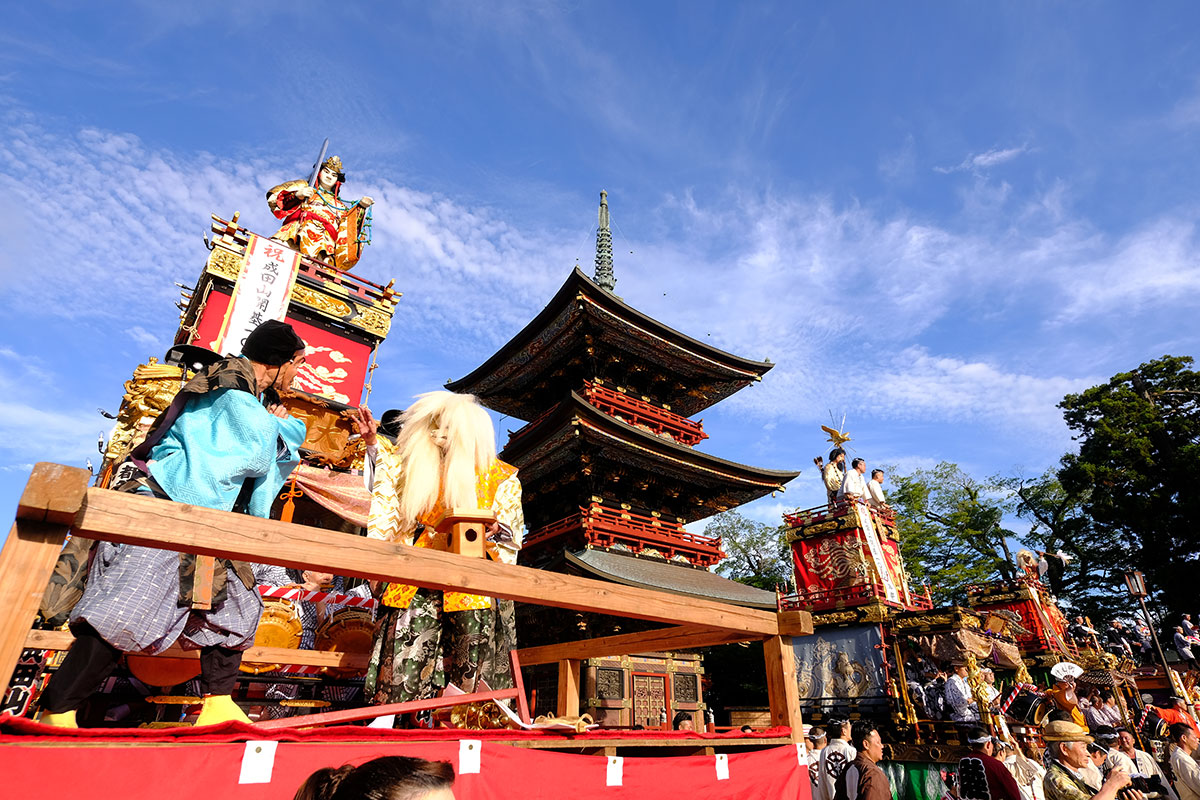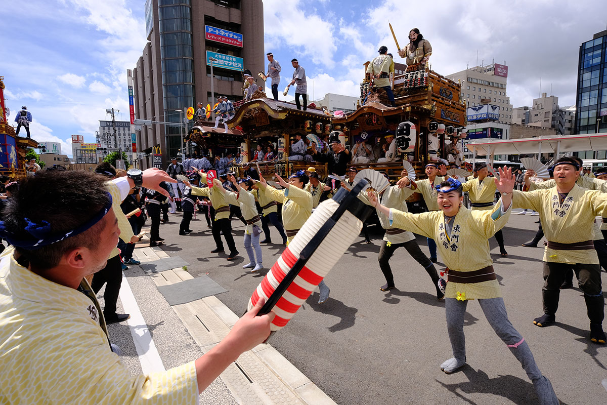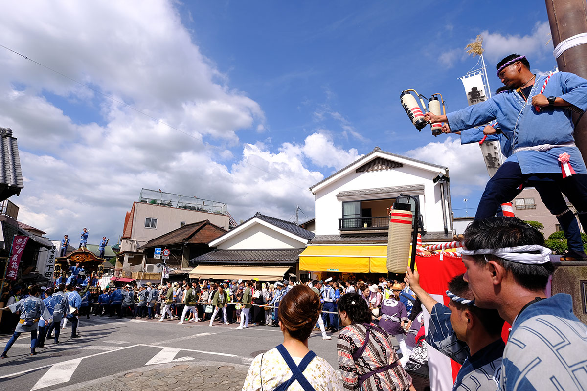 初日の雨があがり、晴れ渡った空に心地よい風の吹いた二日目。仲之町の坂を東町の山車が登って来ると、青空と雲が印象深い絵になりました。