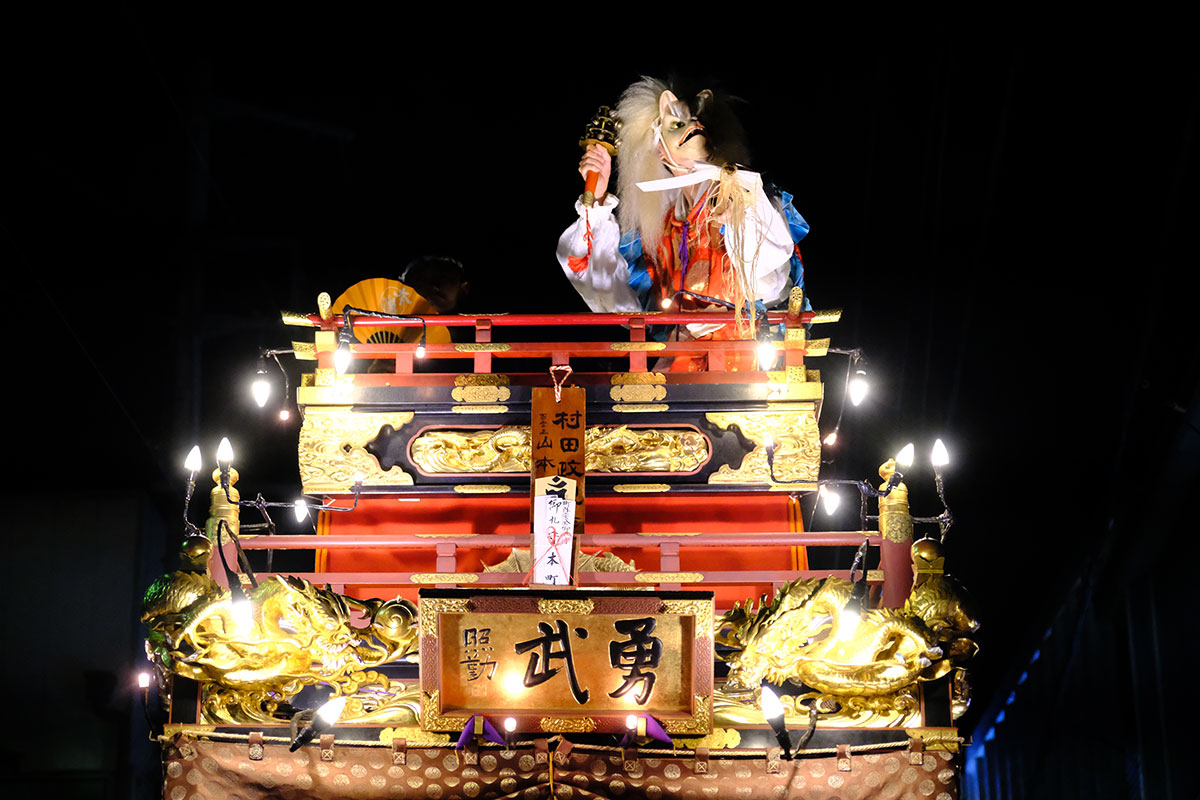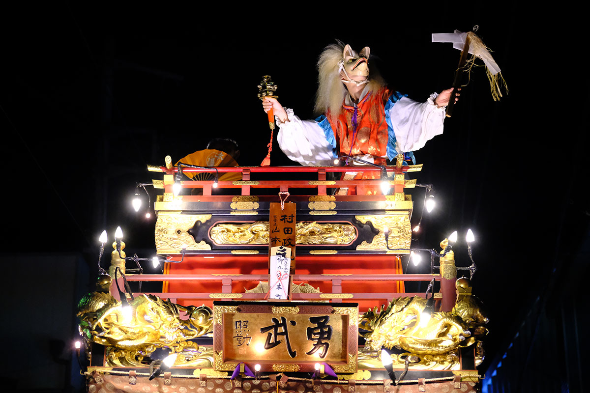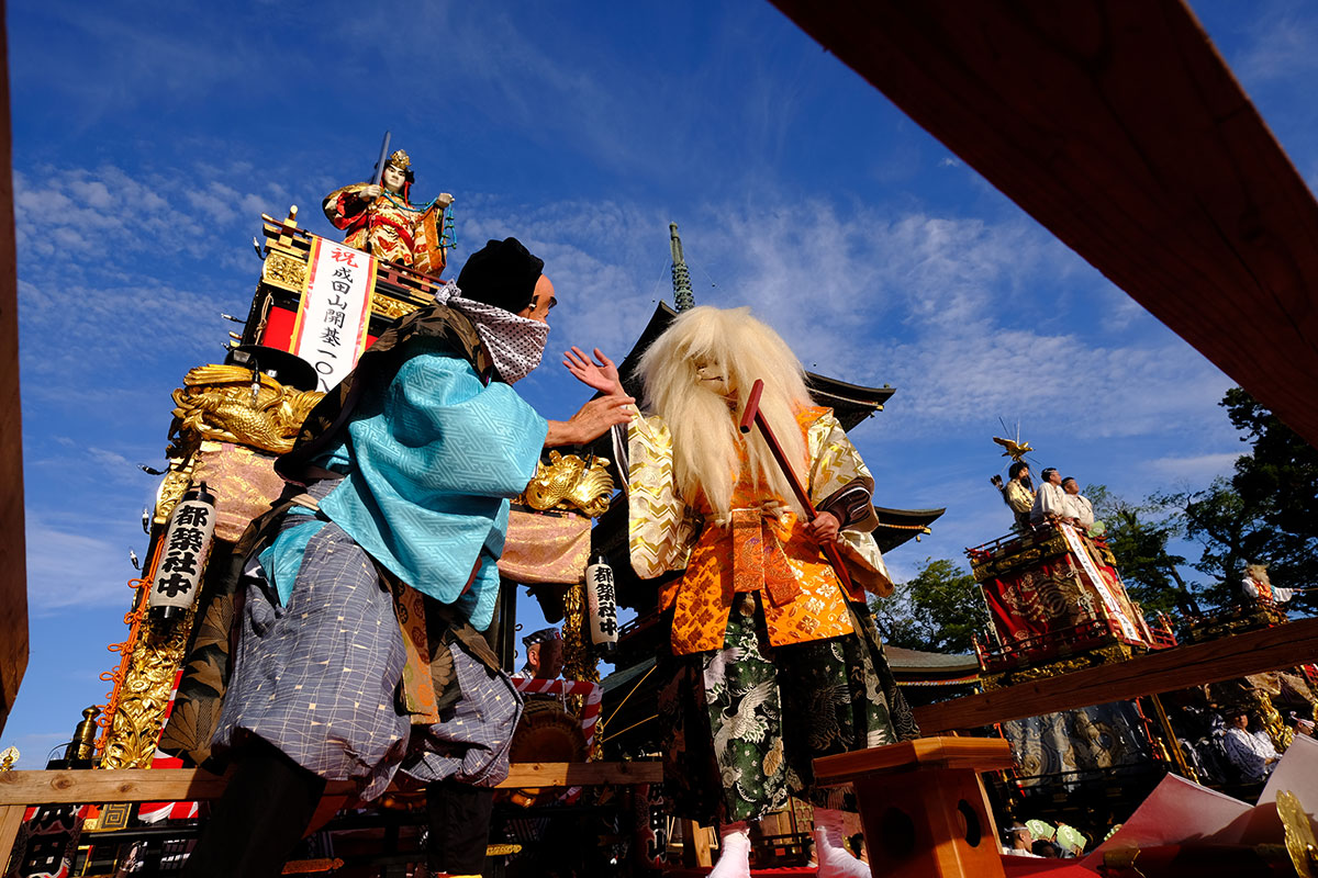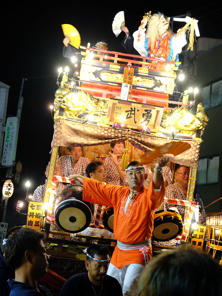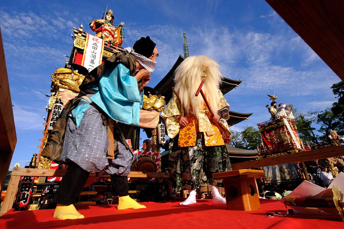 三日目の本堂前。成田山交道会が神楽を披露。都築社中によるものです。夜は本町の山車上で演じられる神楽を撮影。新宿、萩原社中による神楽です。