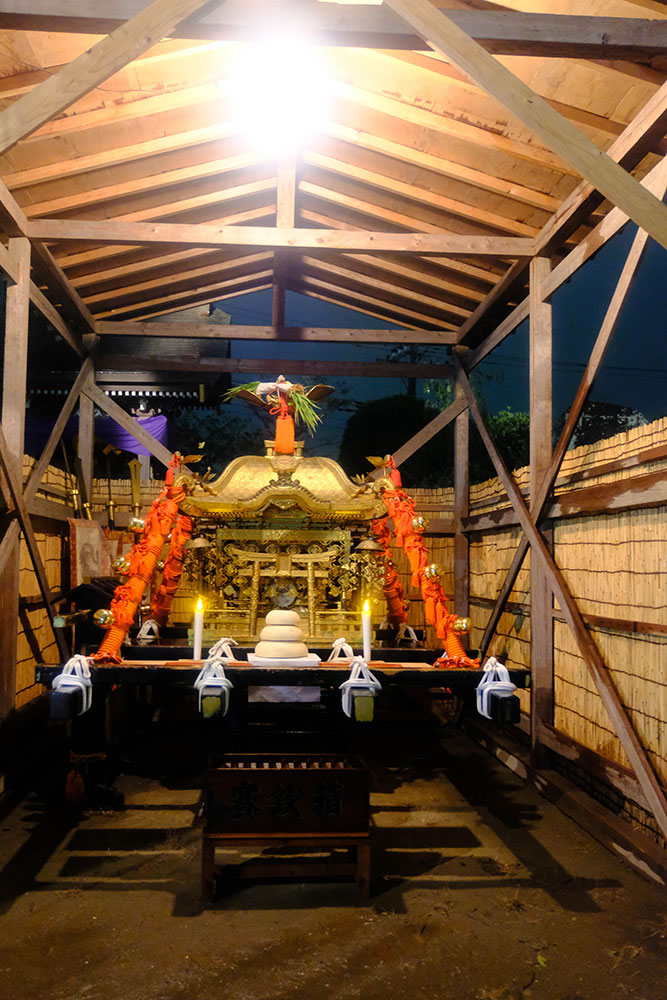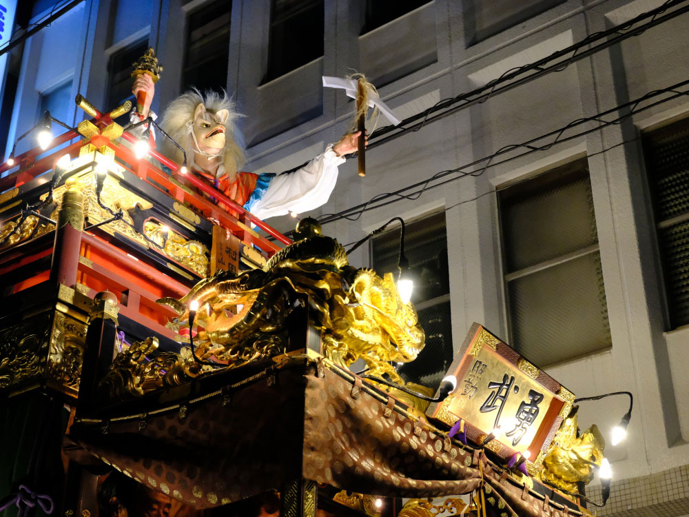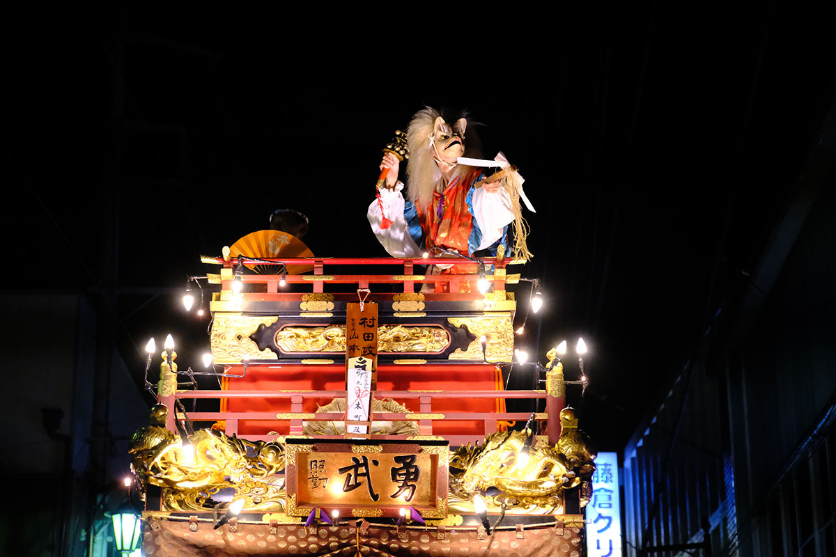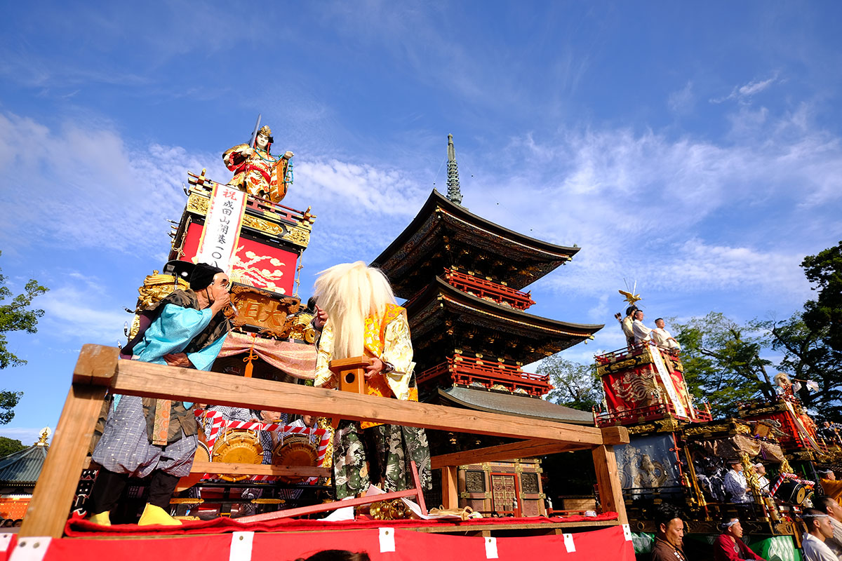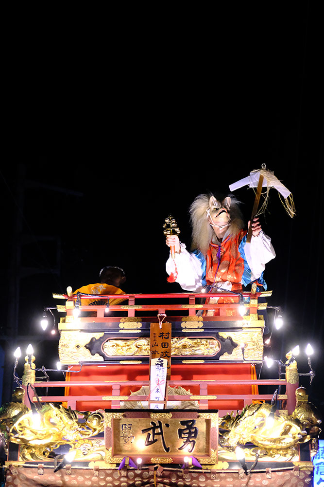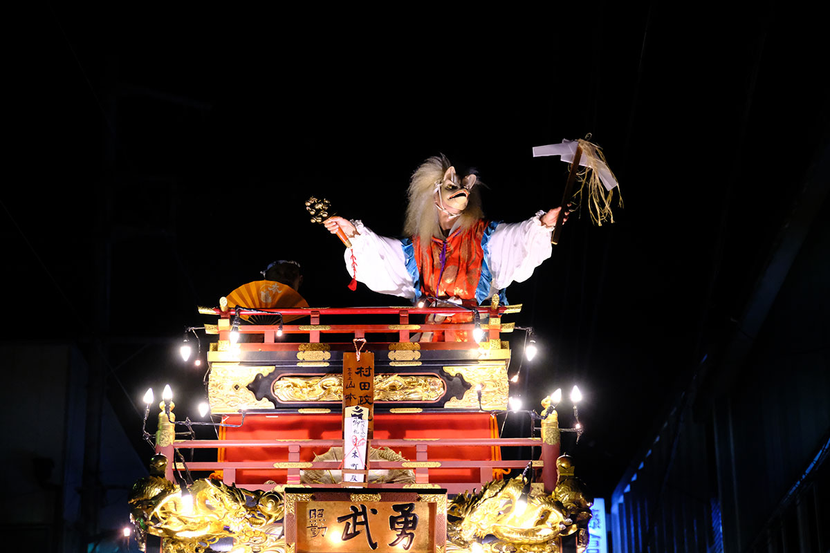 三日目の本堂前。成田山交道会が神楽を披露。都築社中によるものです。夜は本町の山車上で演じられる神楽を撮影。新宿、萩原社中による神楽です。
