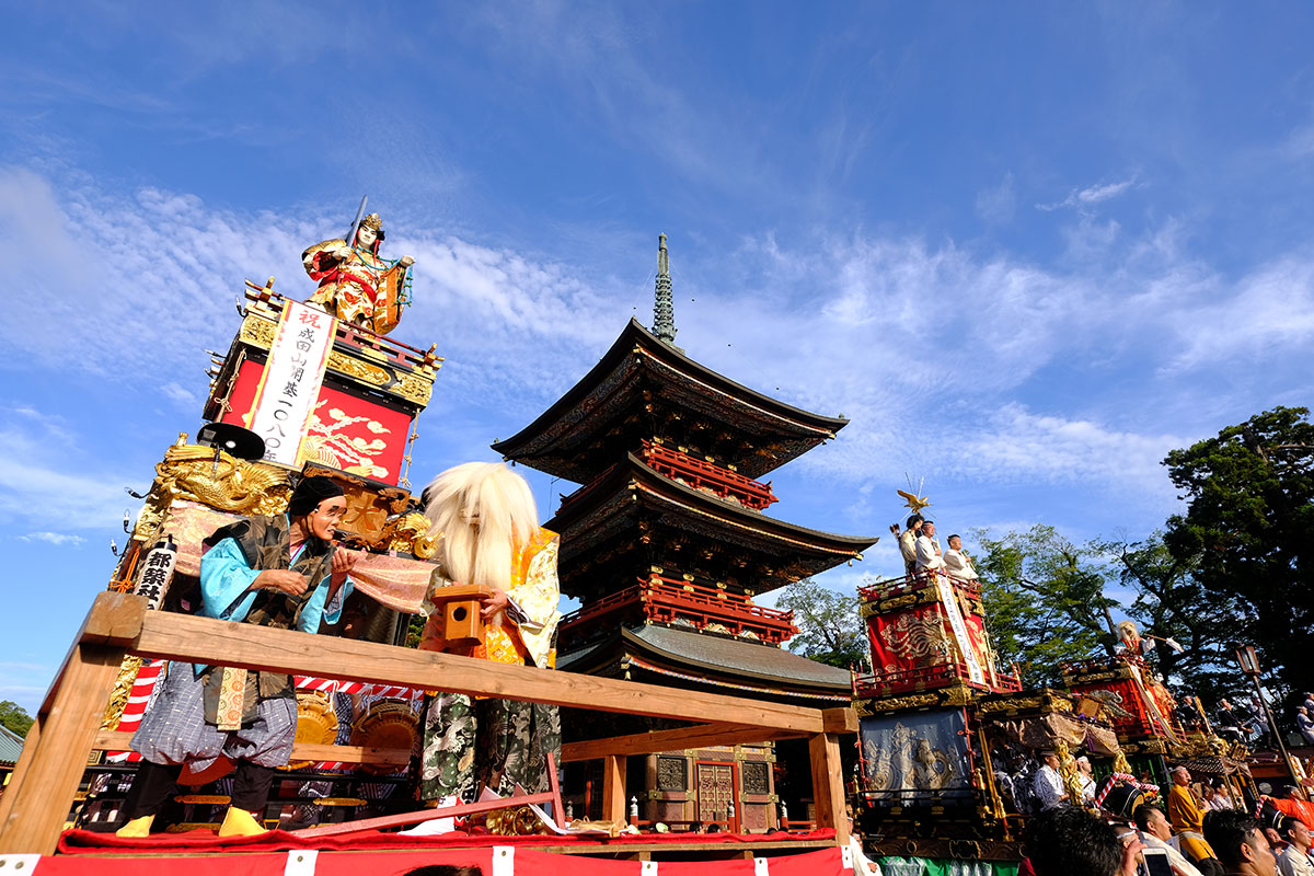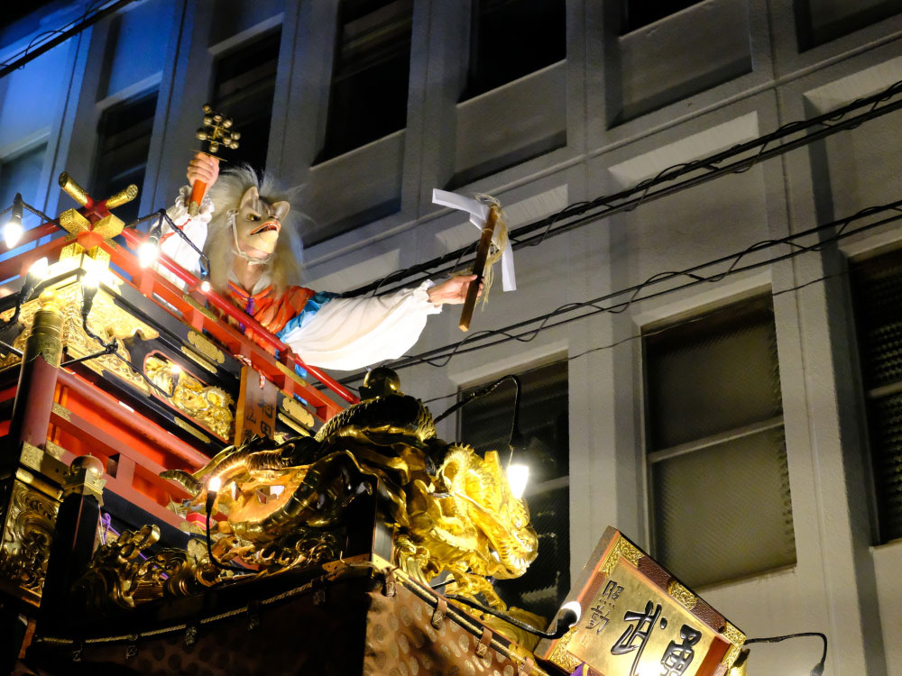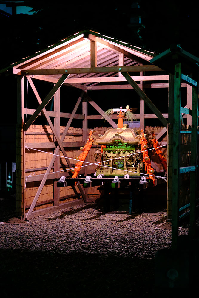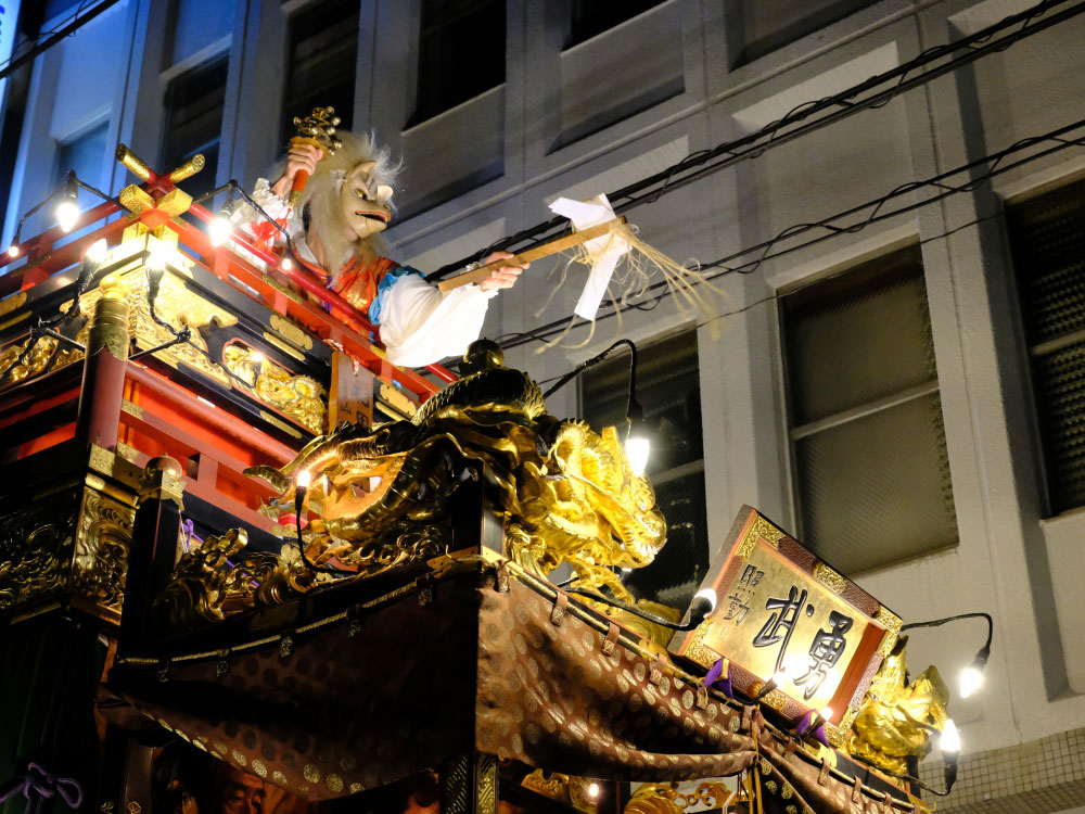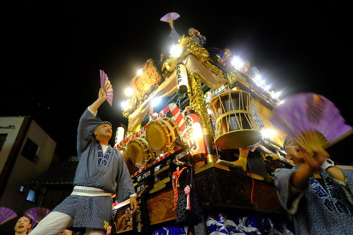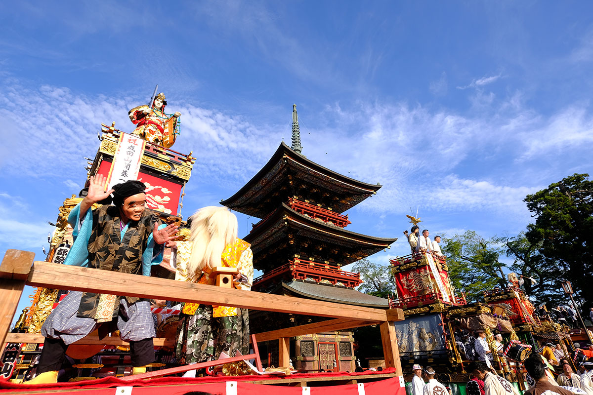 三日目の本堂前。成田山交道会が神楽を披露。都築社中によるものです。夜は本町の山車上で演じられる神楽を撮影。新宿、萩原社中による神楽です。