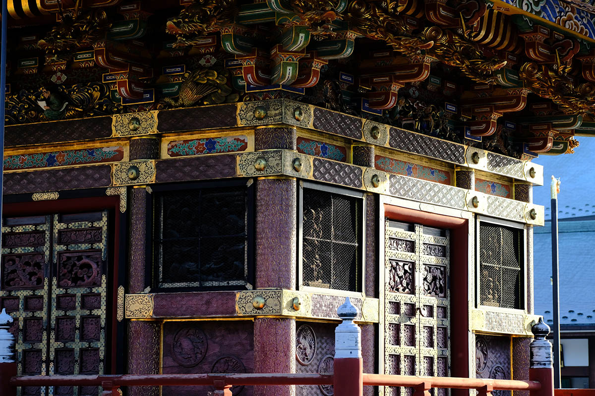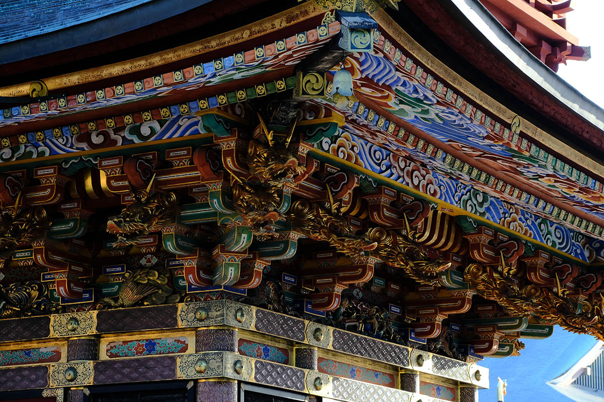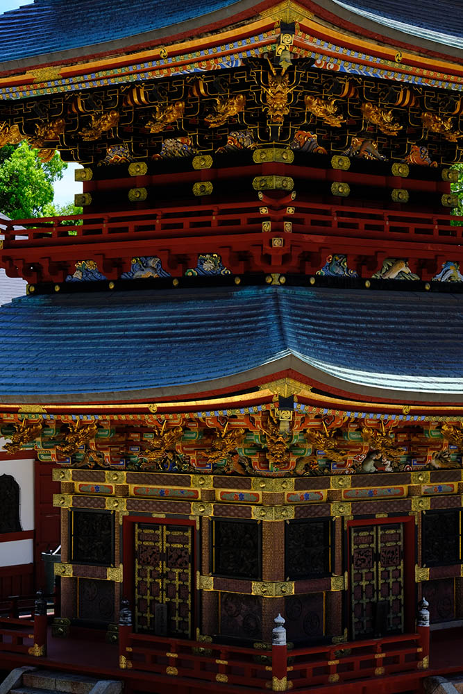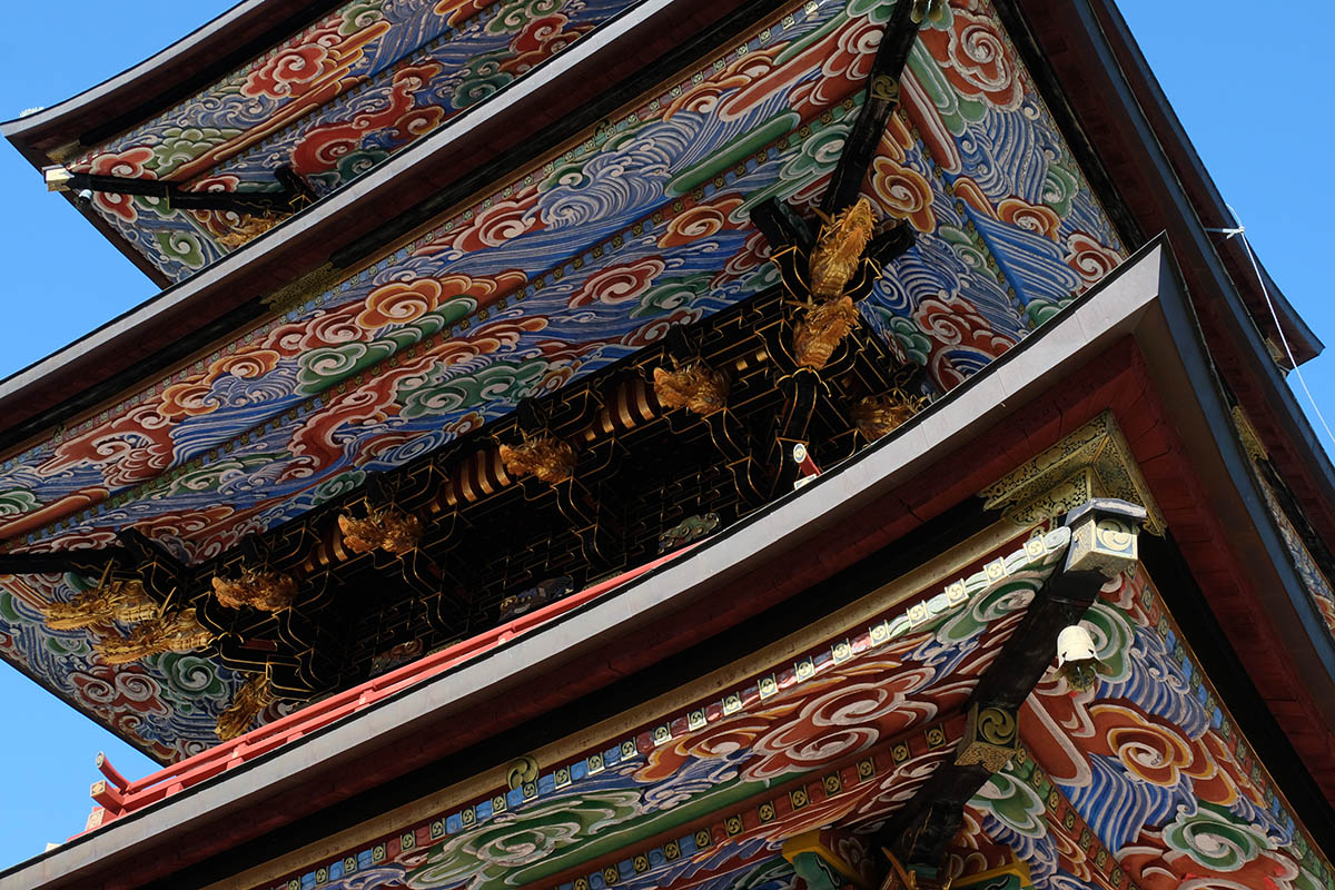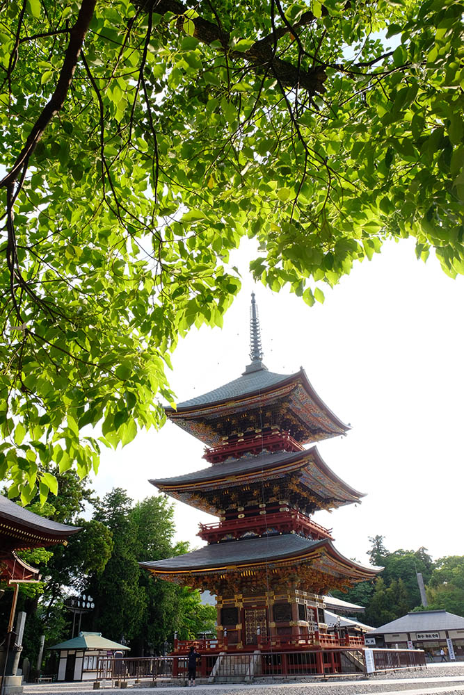 総高25m、塔内には大日如来を中心に五智如来が奉安され、1712(正徳2)年に建立されました。各層の垂木は雲水紋の彫刻がほどこされた一枚板で作られた珍しいもので、江戸期装飾建築の代表例とされています。