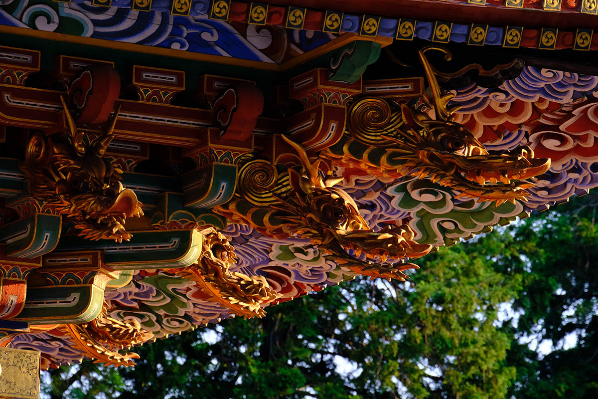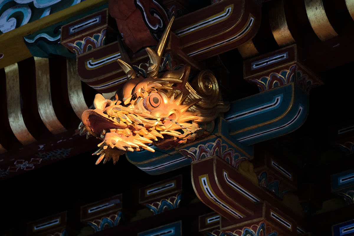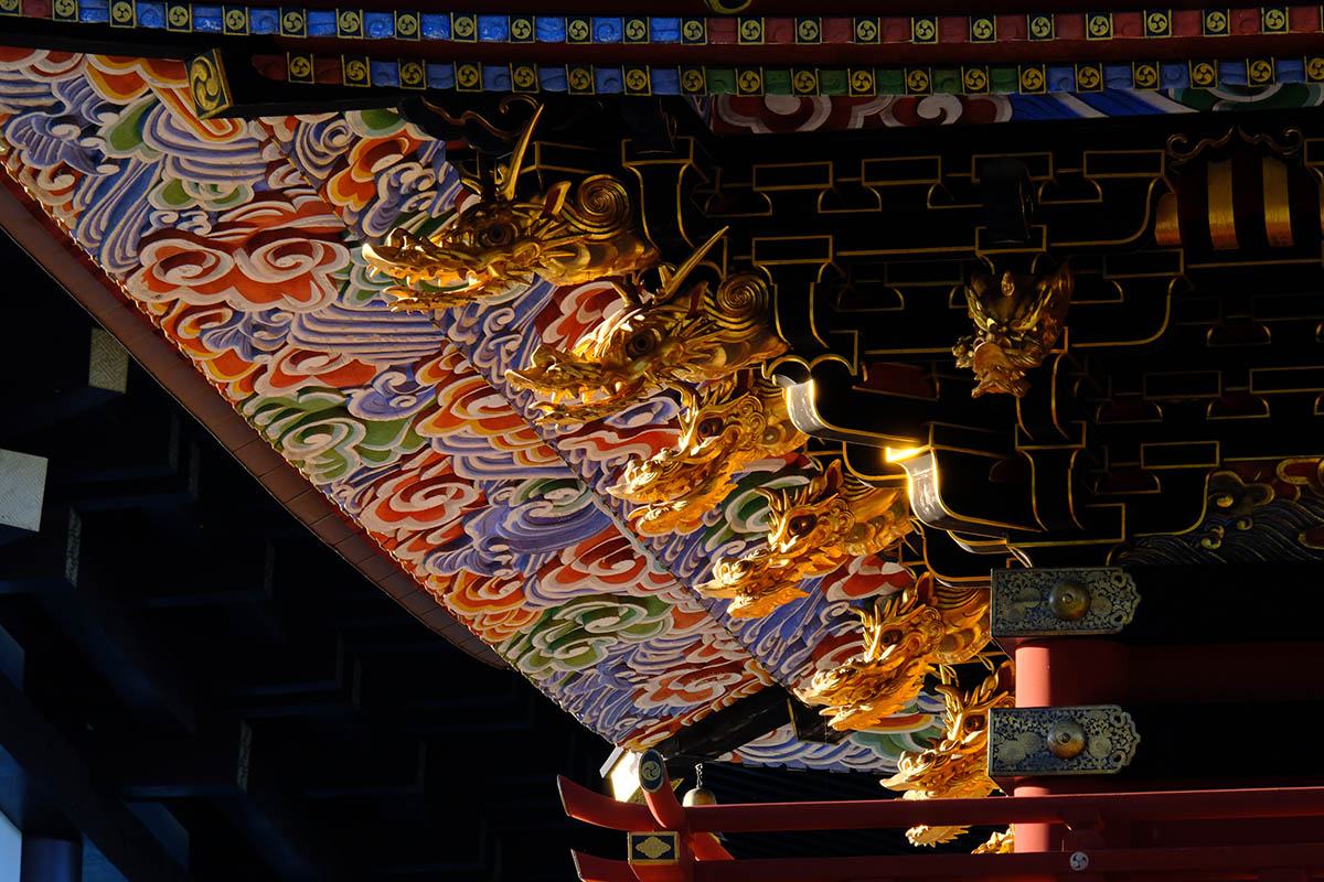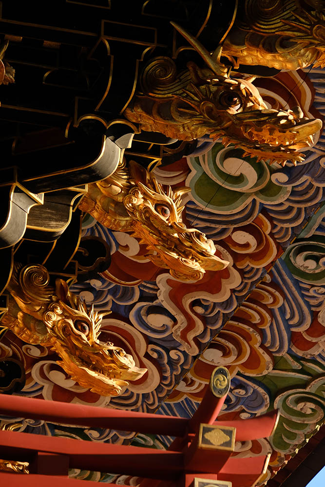 総高25m、塔内には大日如来を中心に五智如来が奉安され、1712(正徳2)年に建立されました。各層の垂木は雲水紋の彫刻がほどこされた一枚板で作られた珍しいもので、江戸期装飾建築の代表例とされています。