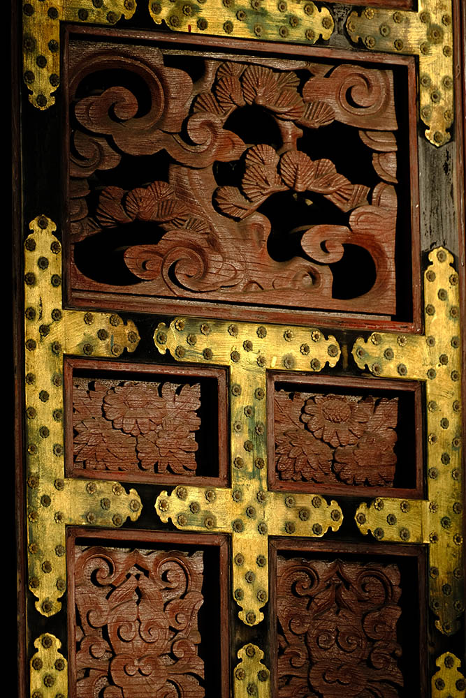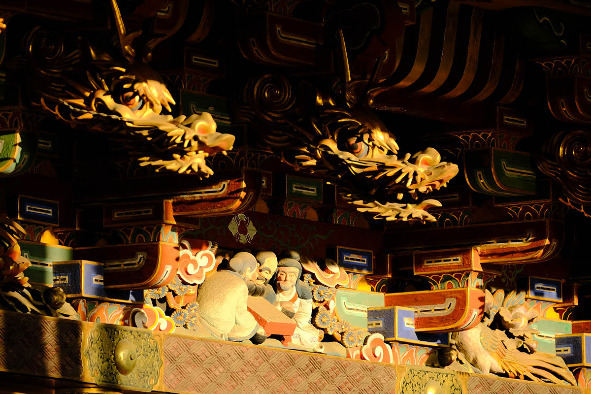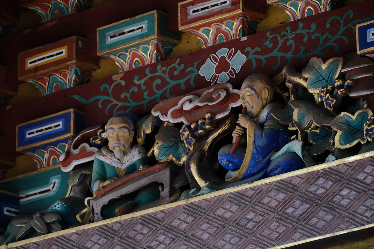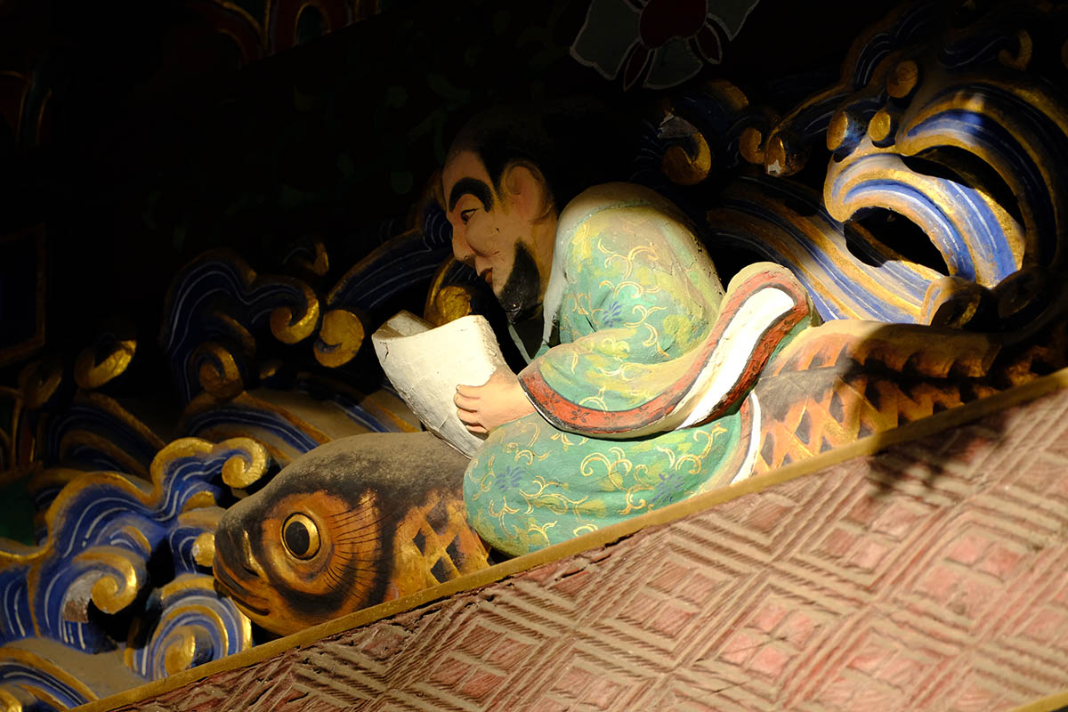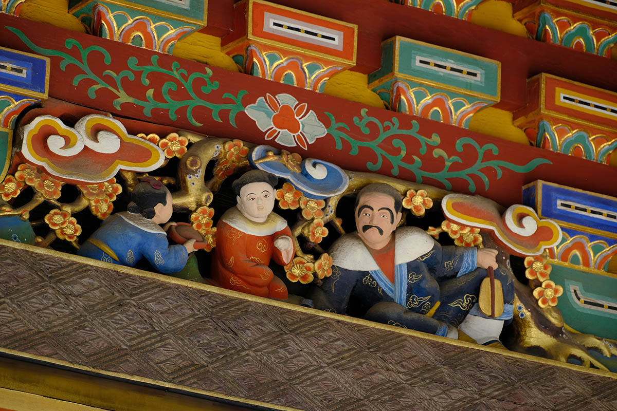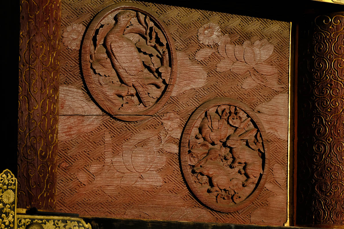 四面の扉の上には「お琴(北側) 囲碁(西側) 琴高仙人(東側) 孟母三遷(南側)」がはめ込まれています