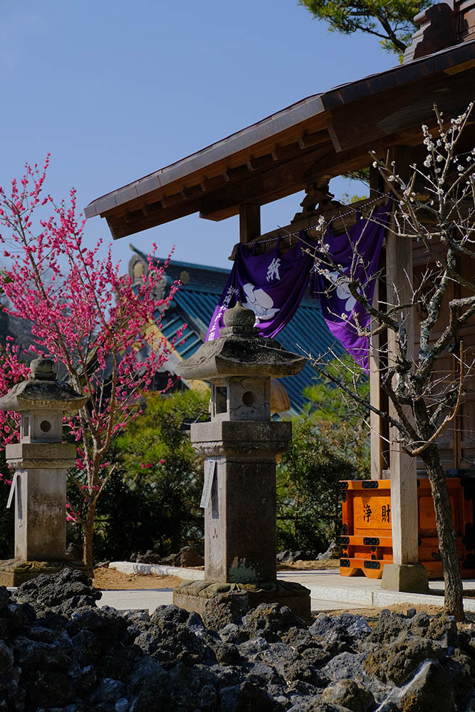 不動利剣と紅白に咲く梅