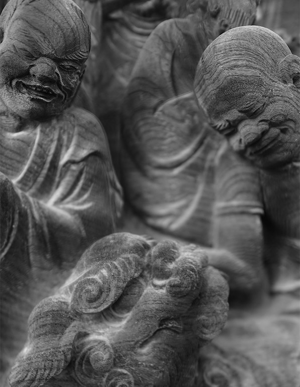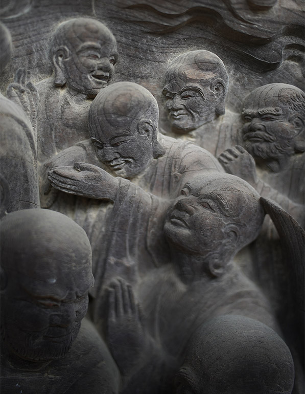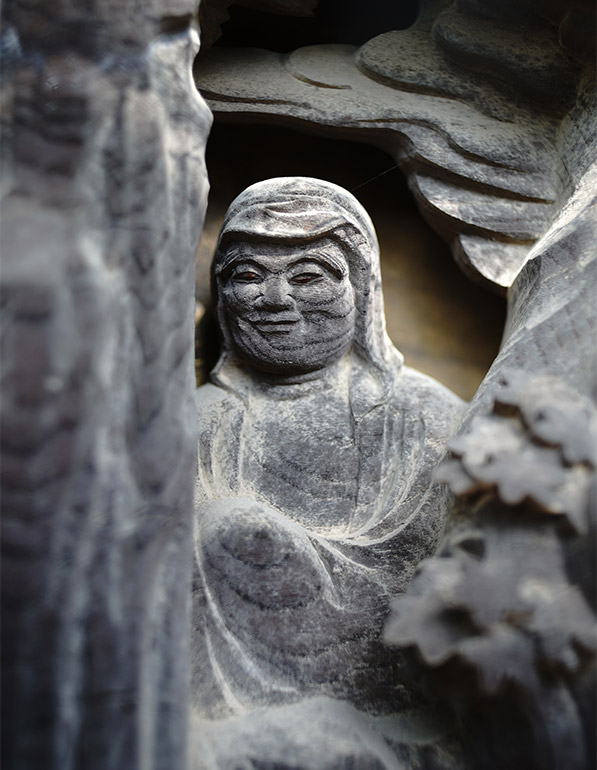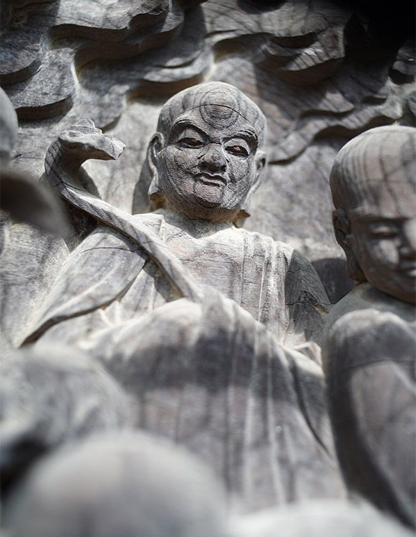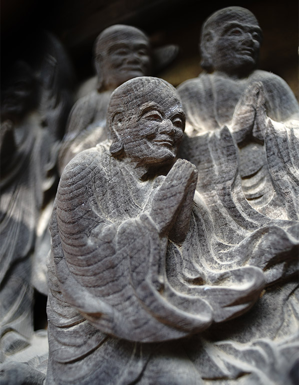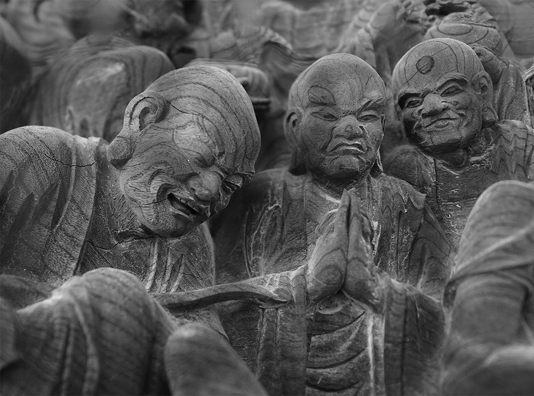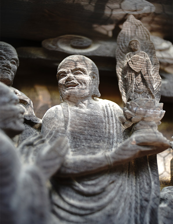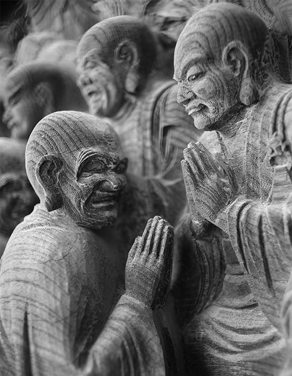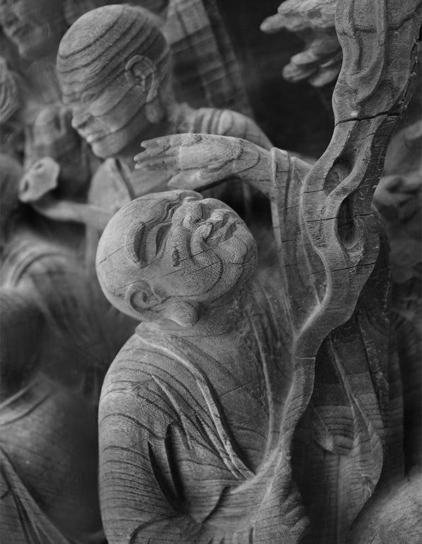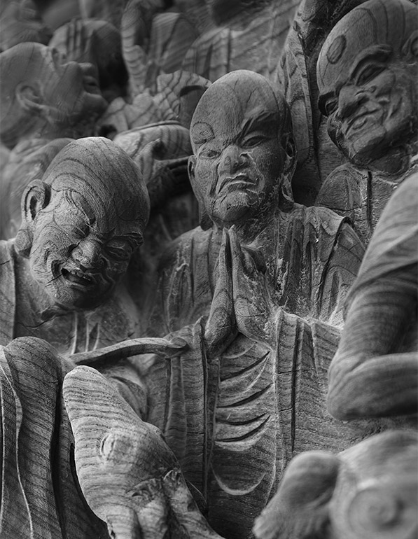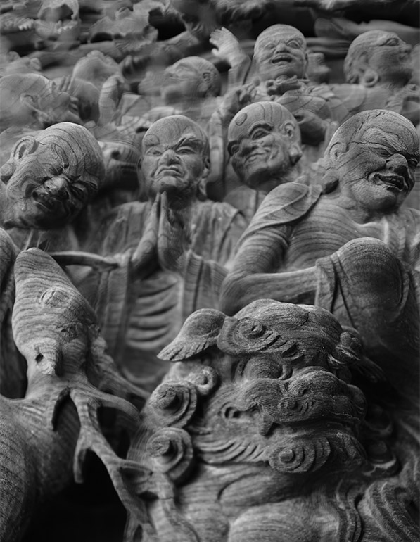 広角レンズとアオリ撮影を更に進め、フラットな光線での群像としての羅漢様の魅力を追い求めました。また、超広角レンズによる「松本良山の彫刻技術の素晴らしさに迫る」という視点からの撮影を加えて構成しました。