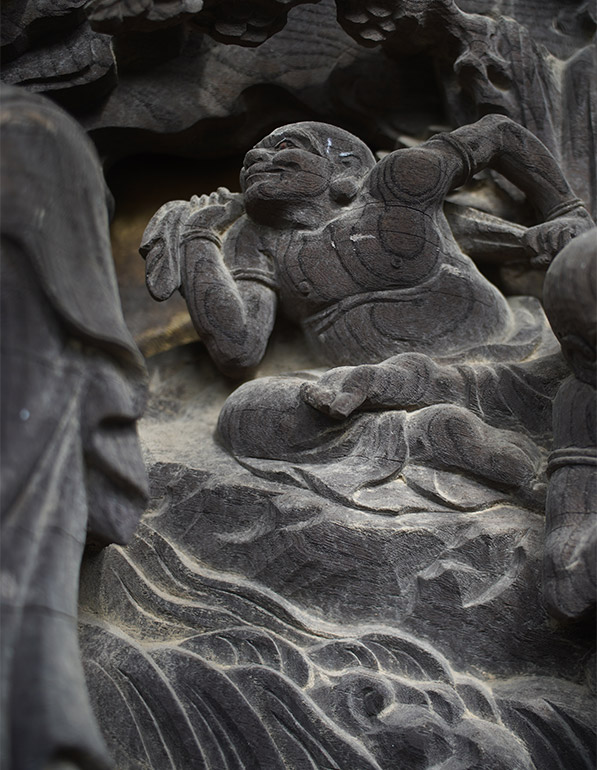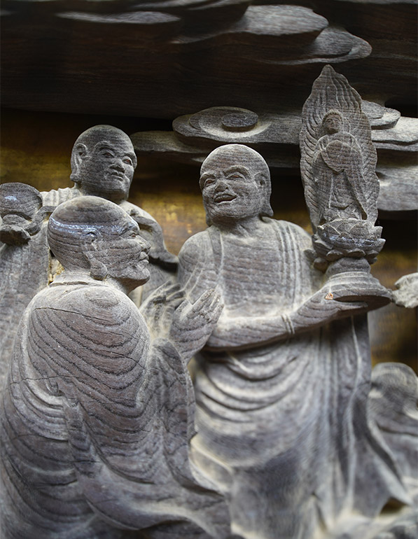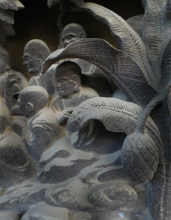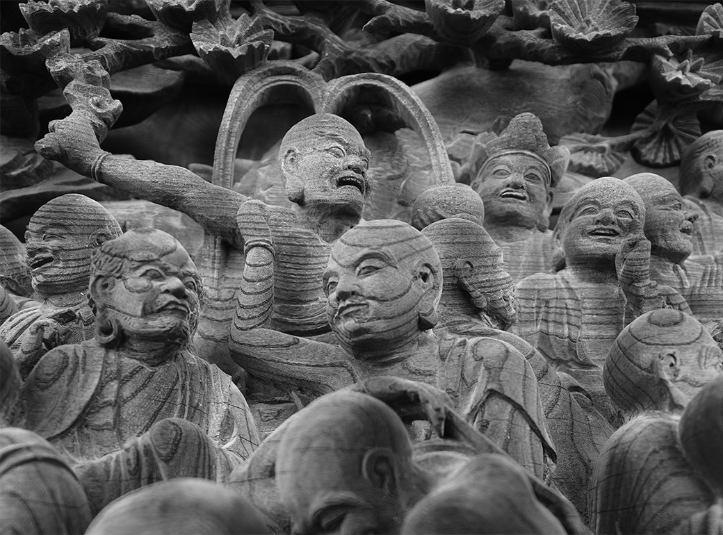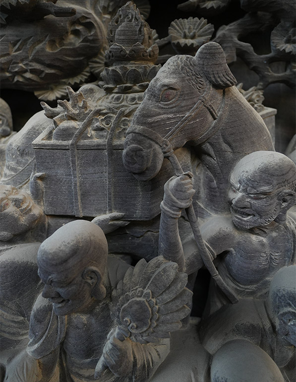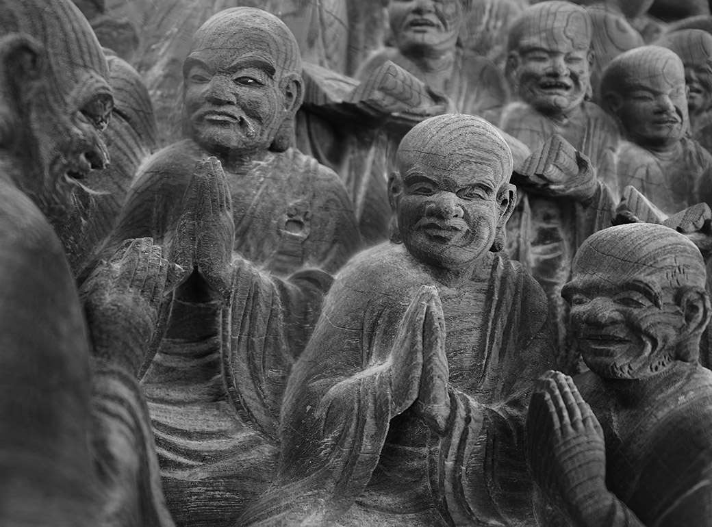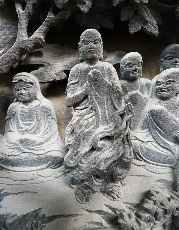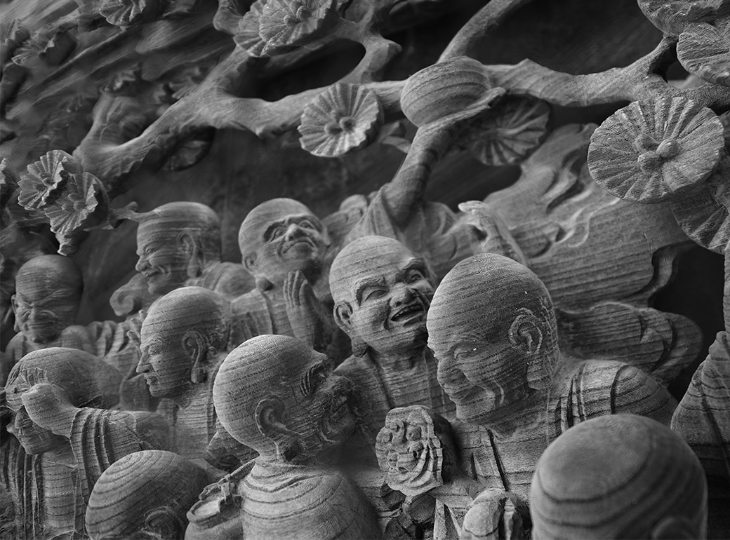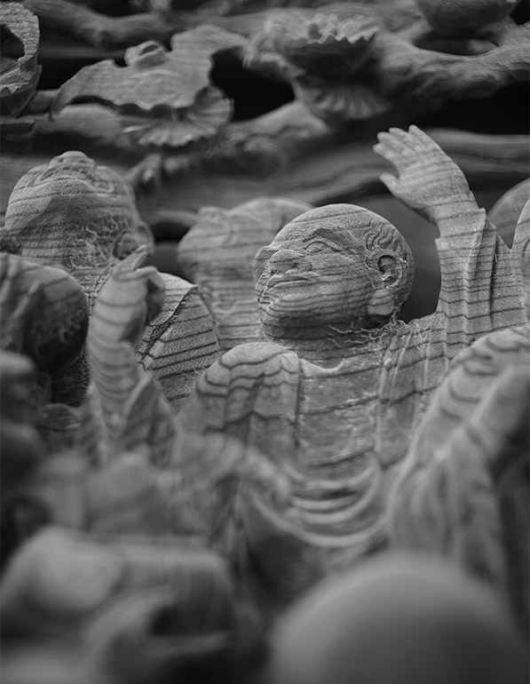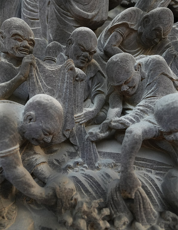 広角レンズとアオリ撮影を更に進め、フラットな光線での群像としての羅漢様の魅力を追い求めました。また、超広角レンズによる「松本良山の彫刻技術の素晴らしさに迫る」という視点からの撮影を加えて構成しました。