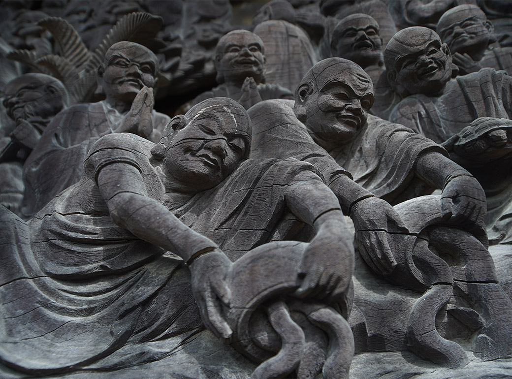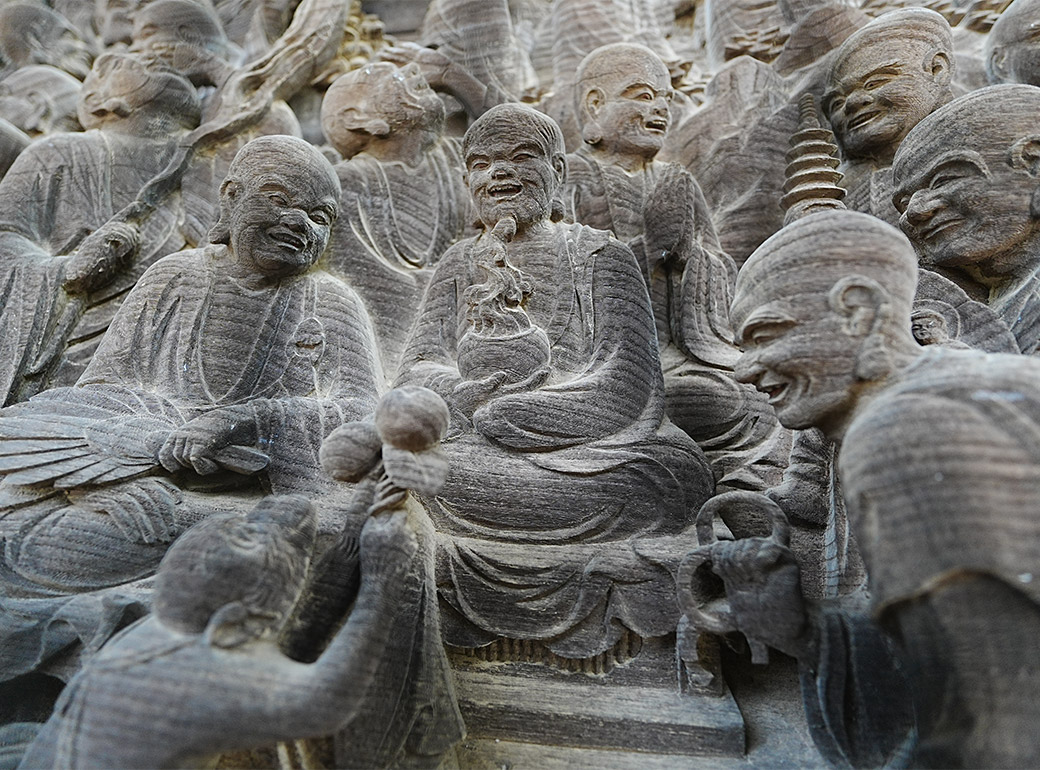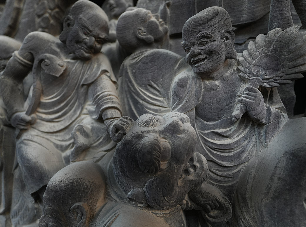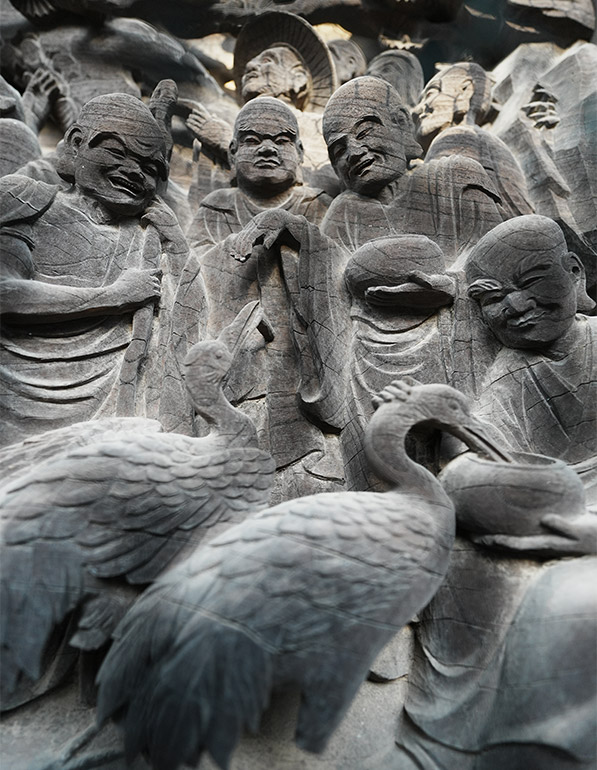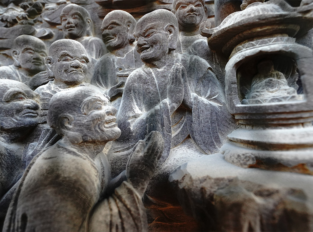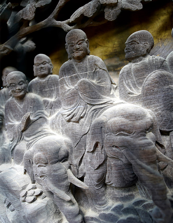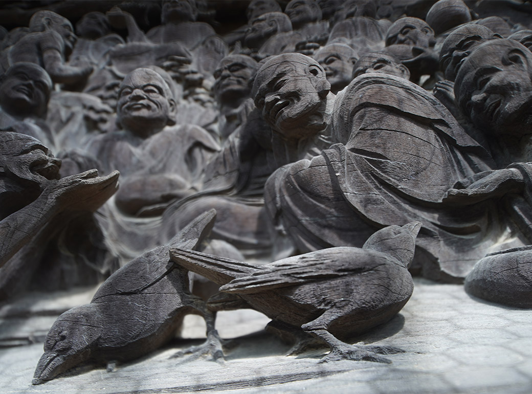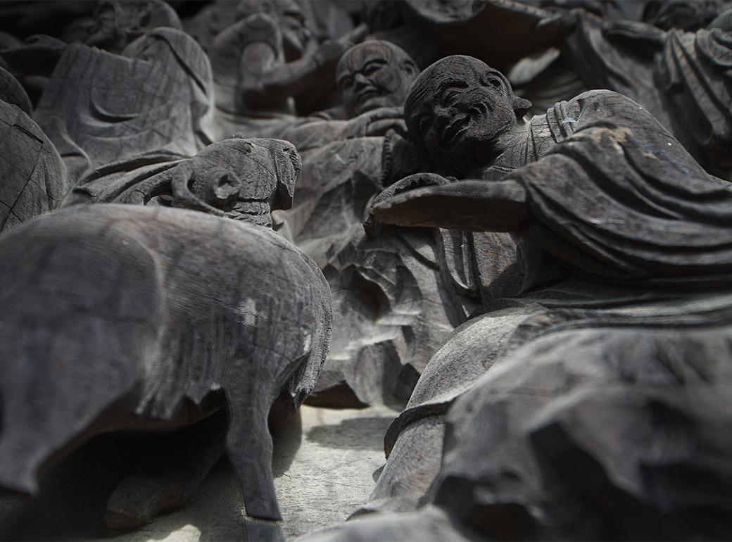 広角レンズとアオリ撮影を更に進め、フラットな光線での群像としての羅漢様の魅力を追い求めました。また、超広角レンズによる「松本良山の彫刻技術の素晴らしさに迫る」という視点からの撮影を加えて構成しました。